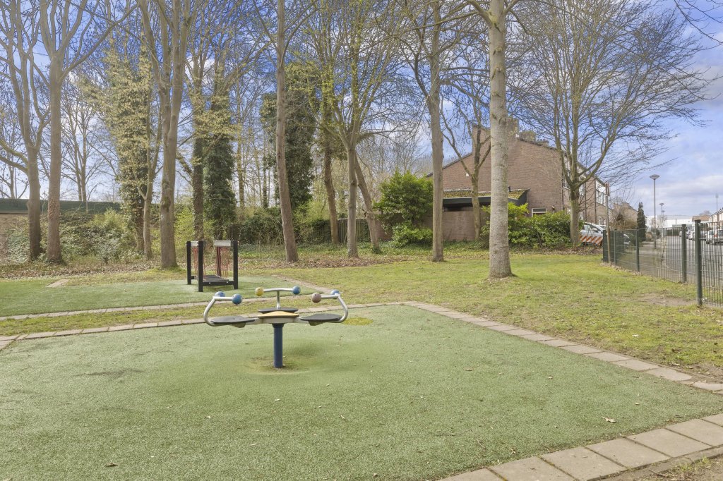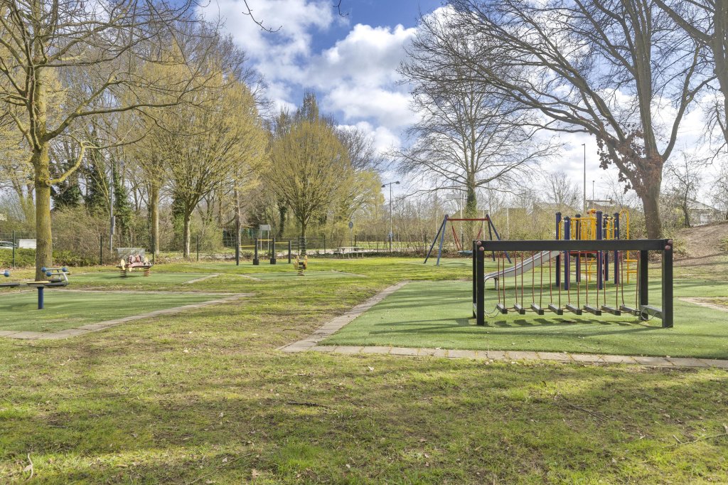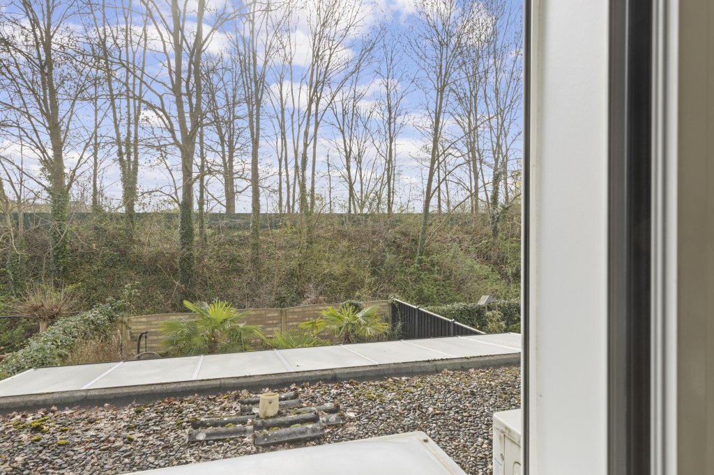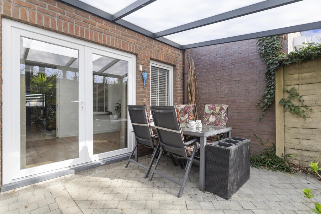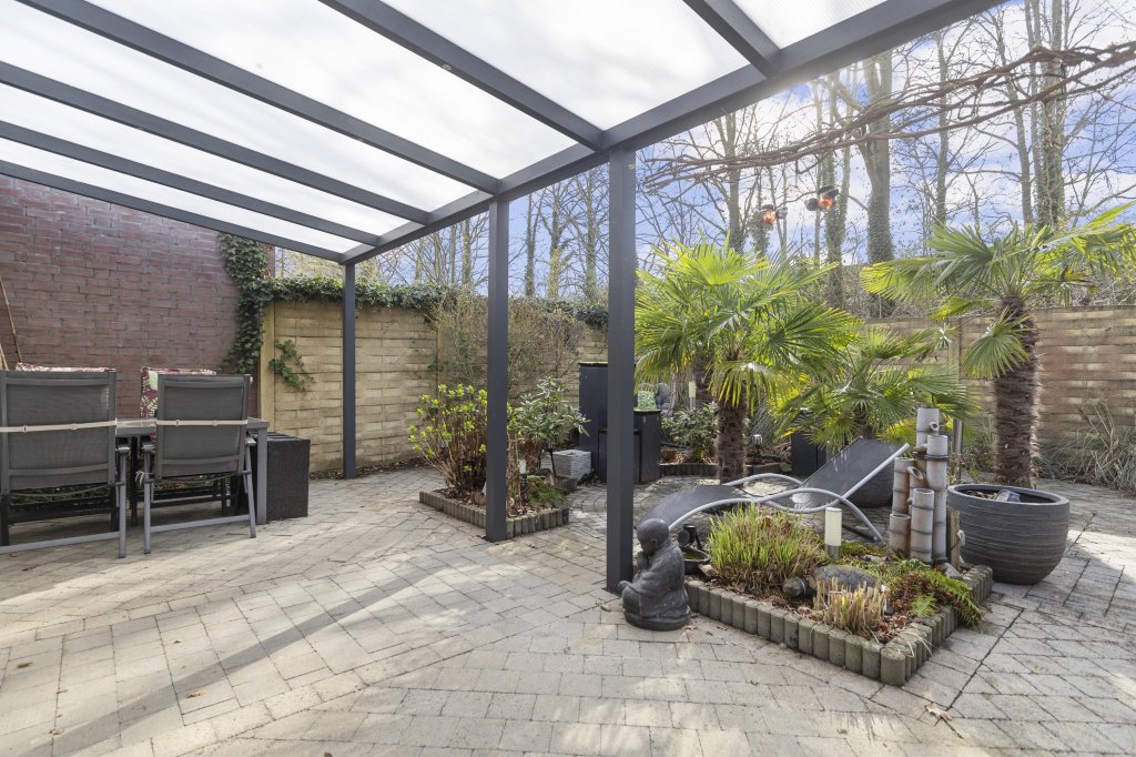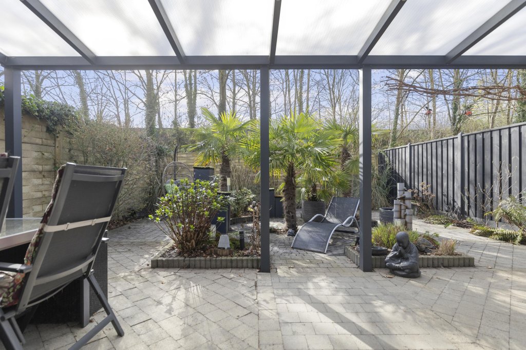 De groene achtertuin is gunstig gelegen op het zuiden, waardoor u volop kunt genieten van de middagzon. Onder de sfeervolle terrasoverkapping is het heerlijk ontspannen, borrelen of lang tafelen met familie en vrienden. Vanuit de tuin kijkt men uit over het groen.