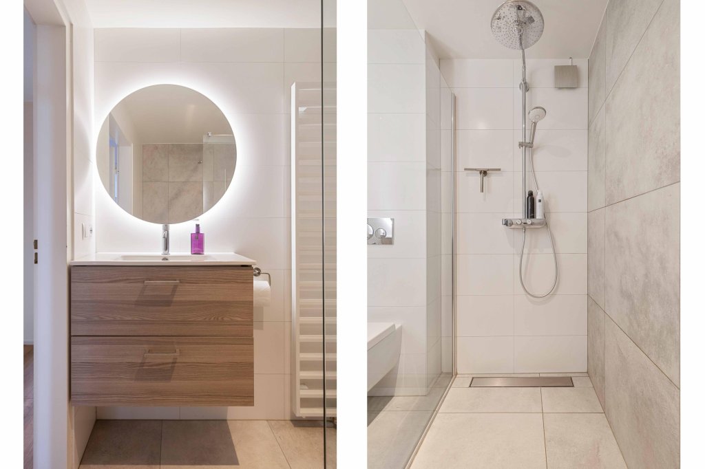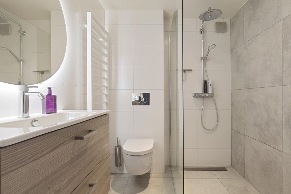 De moderne badkamer is voorzien van inloopdouche, wastafel met meubel en een tweede toilet.