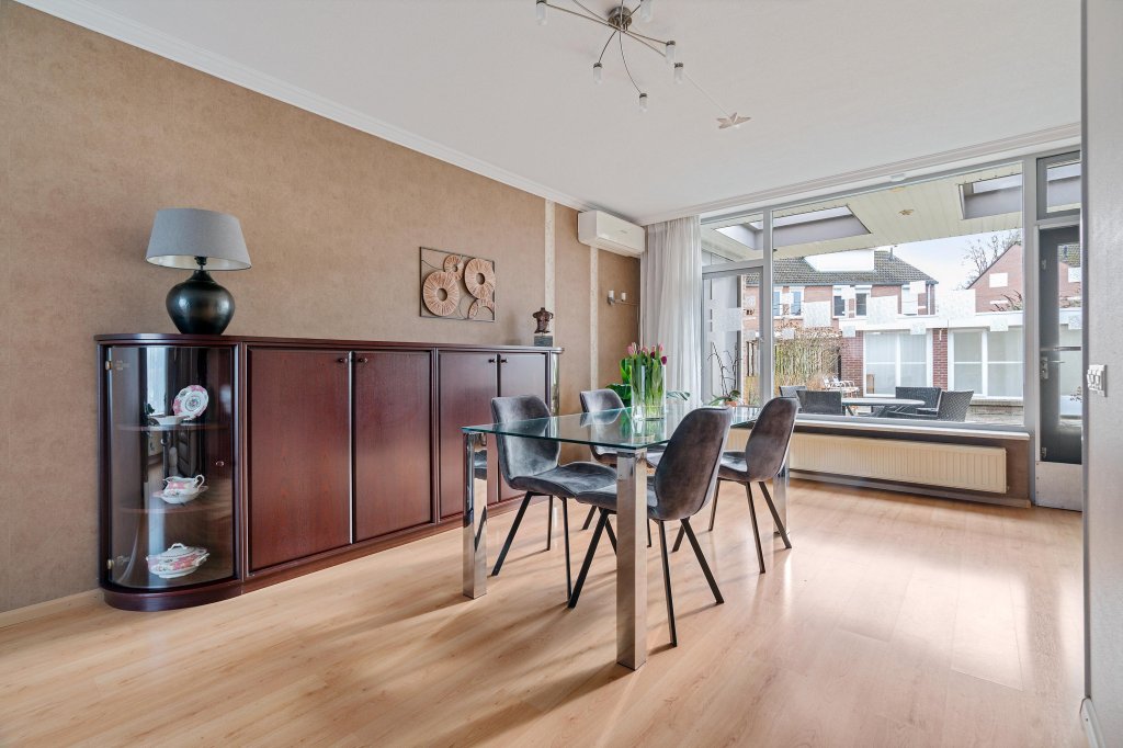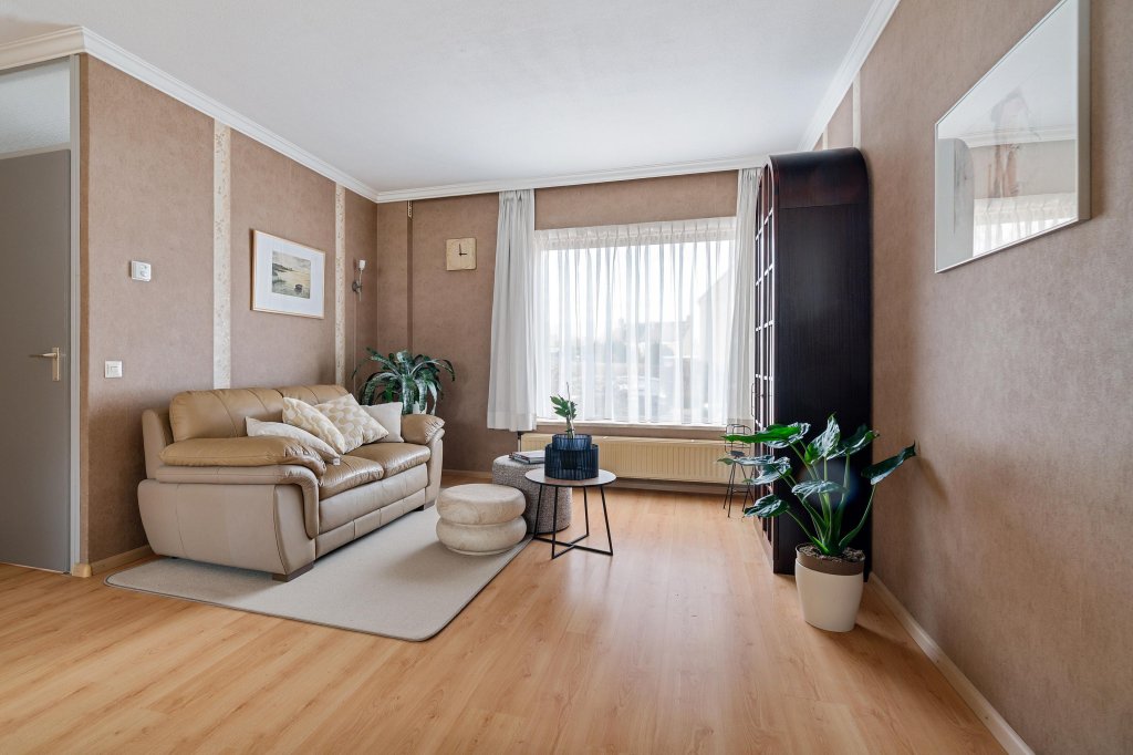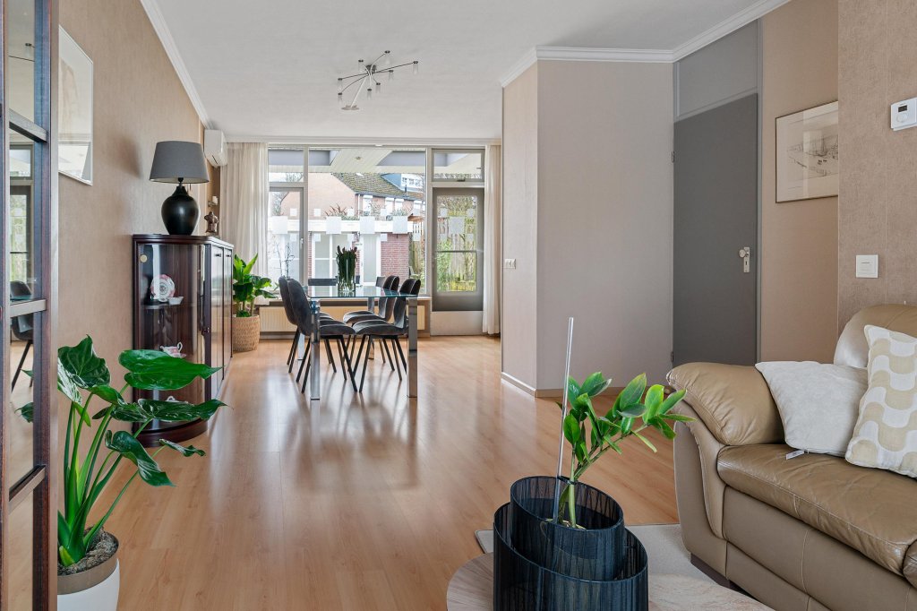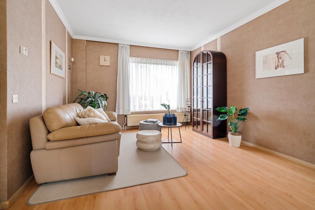 De riante woonkamer biedt volop leefruimte en is afgewerkt met een laminaatvloer en doorgang naar de open keuken. U geniet u van extra licht en ruimte. Vanuit hier heeft u directe toegang tot het terras met overkapping en de achtertuin.