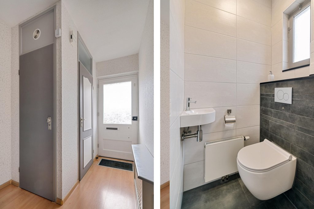 Via de ontvangsthal met meterkast en trapopgang naar de eerste verdieping betreedt u de woning. Het geheel betegelde toilet is uitgevoerd met een zwevend closet en fonteintje.