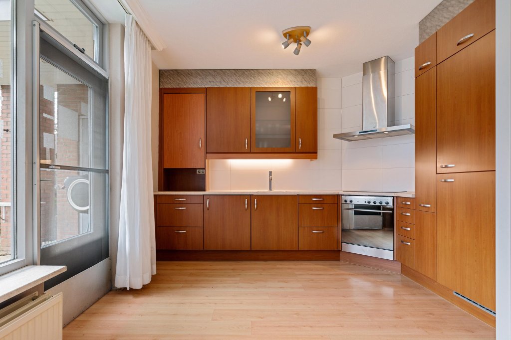 De semi-open keuken (2020) is modern uitgevoerd en opgesteld in een praktische L-vorm. De keuken is voorzien van diverse inbouwapparatuur, waaronder een inductiekookplaat, vaatwasser, combi-oven, RVS-afzuigkap en koelkast – ideaal voor de kookliefhebber.
