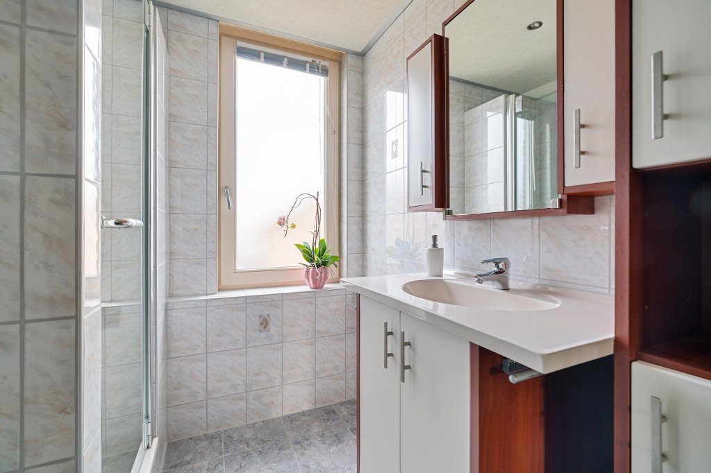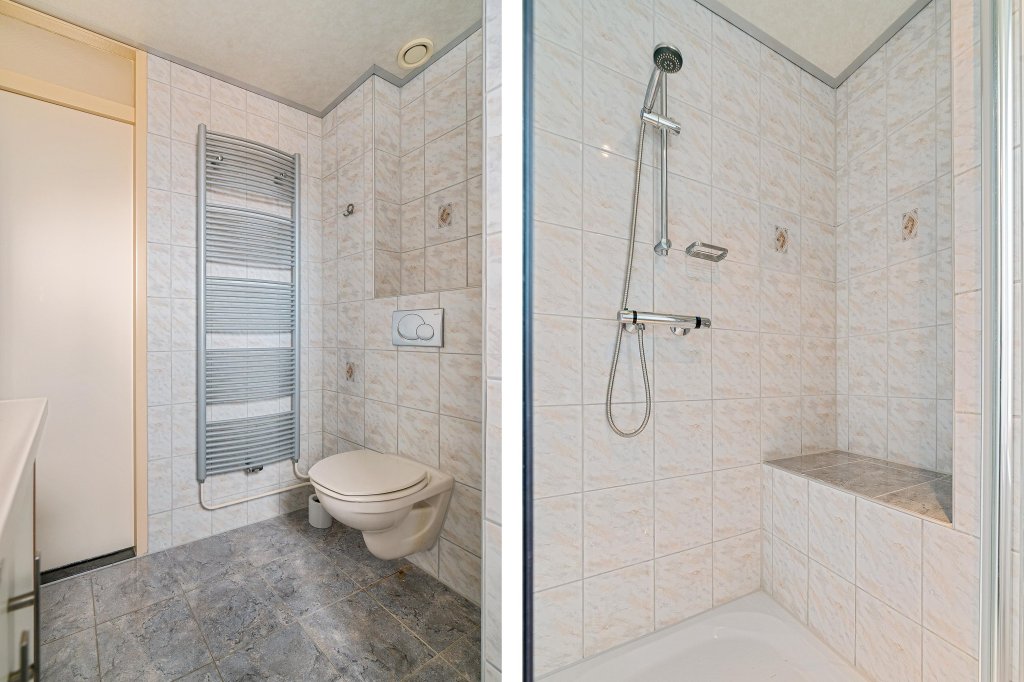 De geheel betegelde badkamer is functioneel ingericht en voorzien van een douche, vaste wastafel met badmeubel en een tweede toilet.
