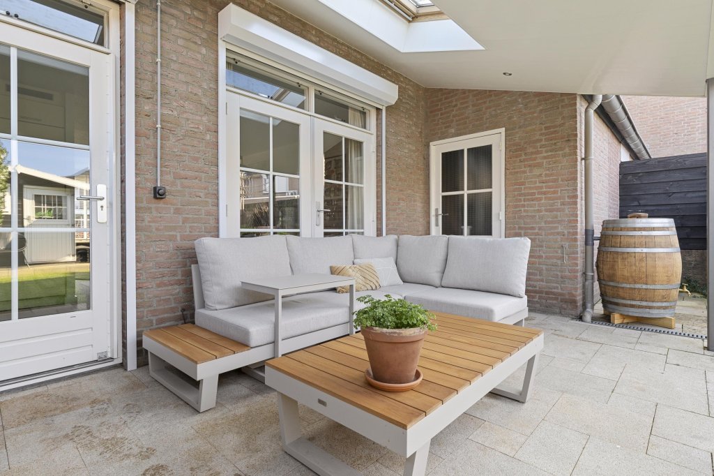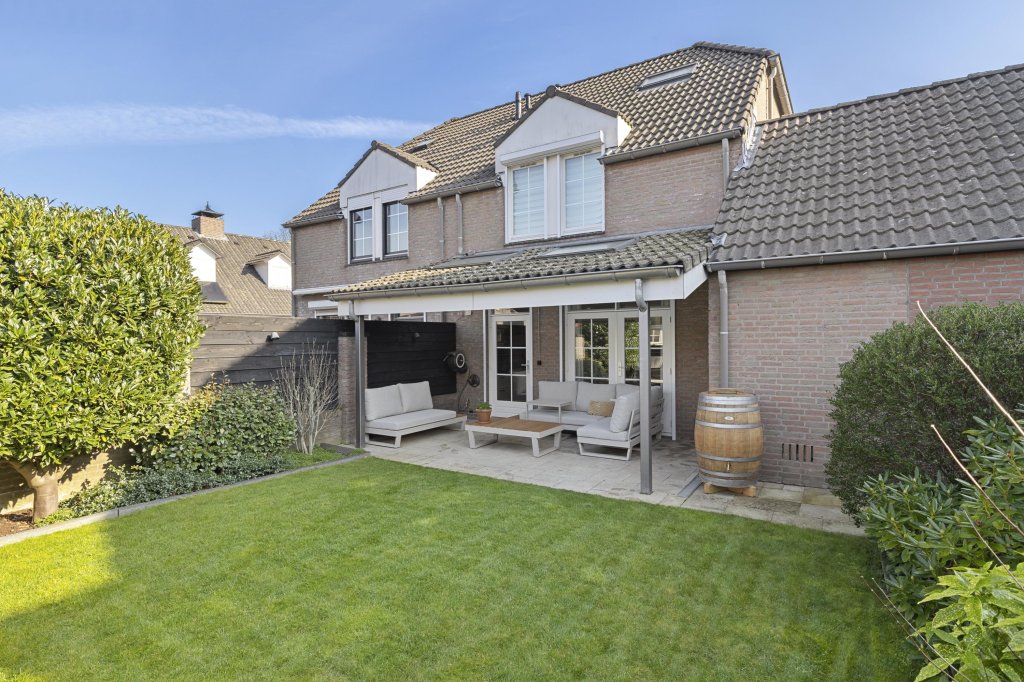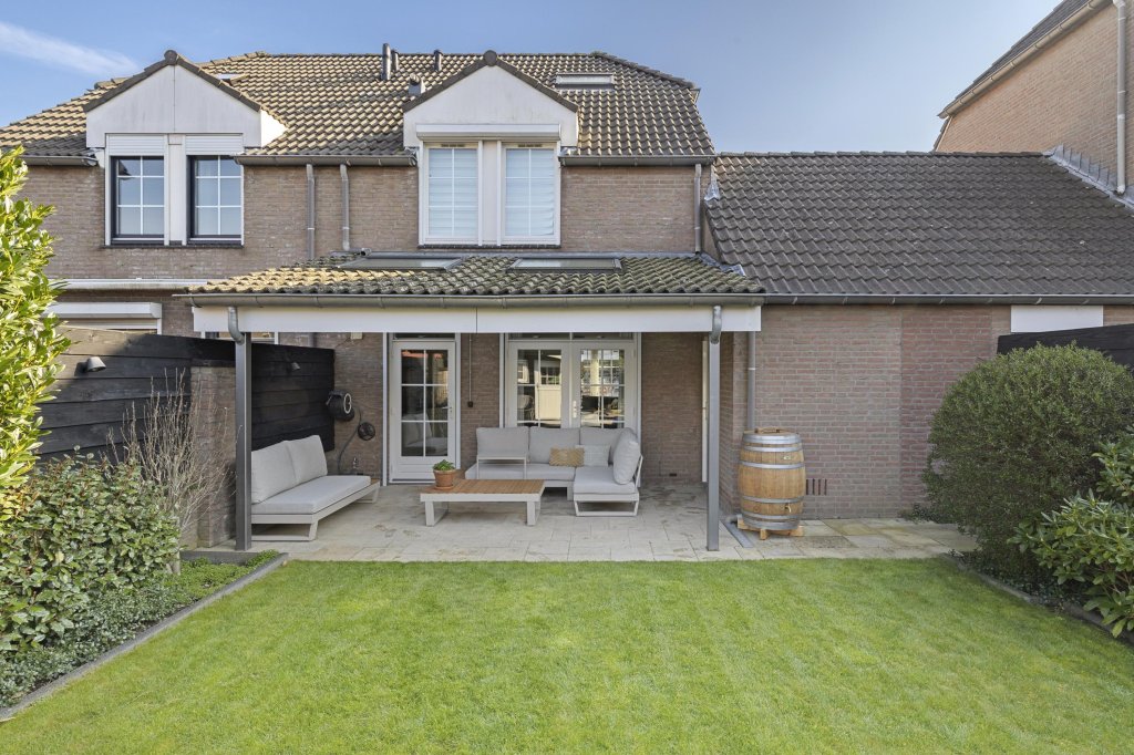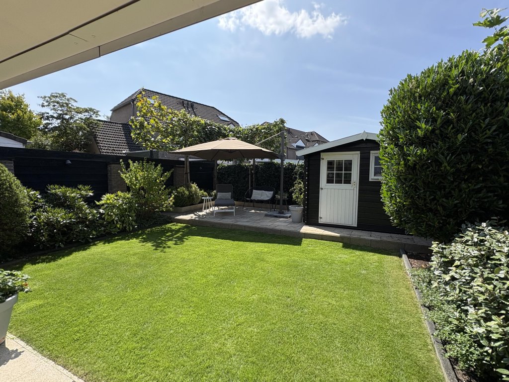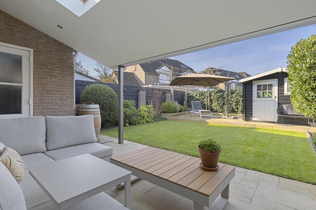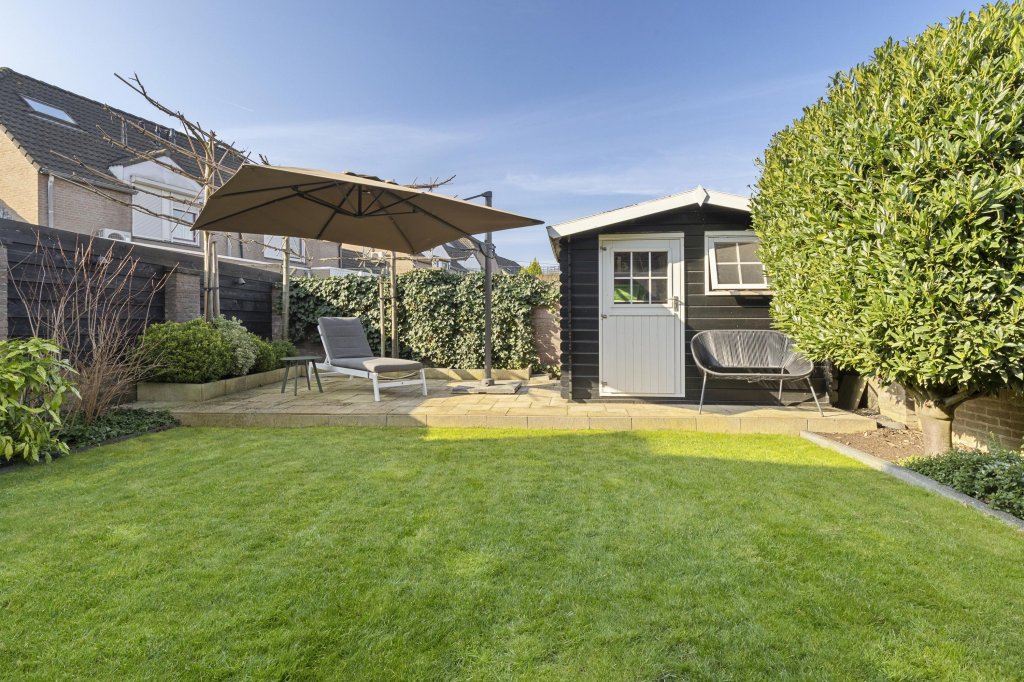 De strak aangelegde achtertuin is gunstig gelegen op het westen, waardoor u volop kunt genieten van de middag- en avondzon. Onder de sfeervolle terrasoverkapping is het heerlijk ontspannen, borrelen of lang tafelen met familie en vrienden. De tuin is tevens voorzien van een tuinhuis, gazon en borders.