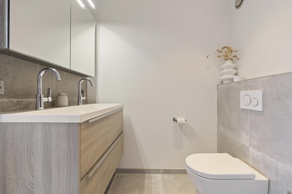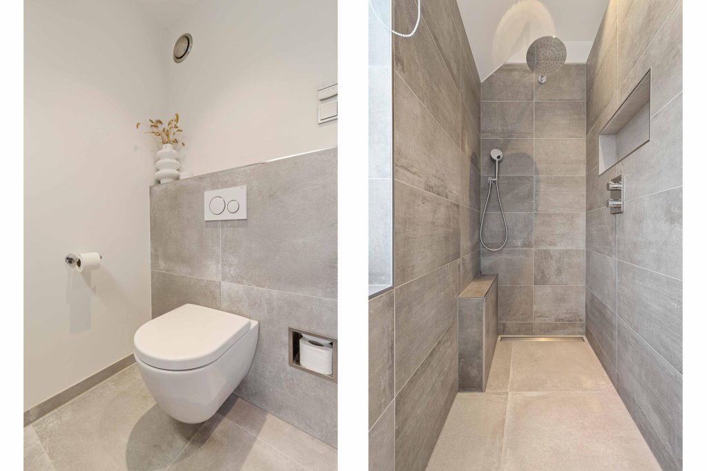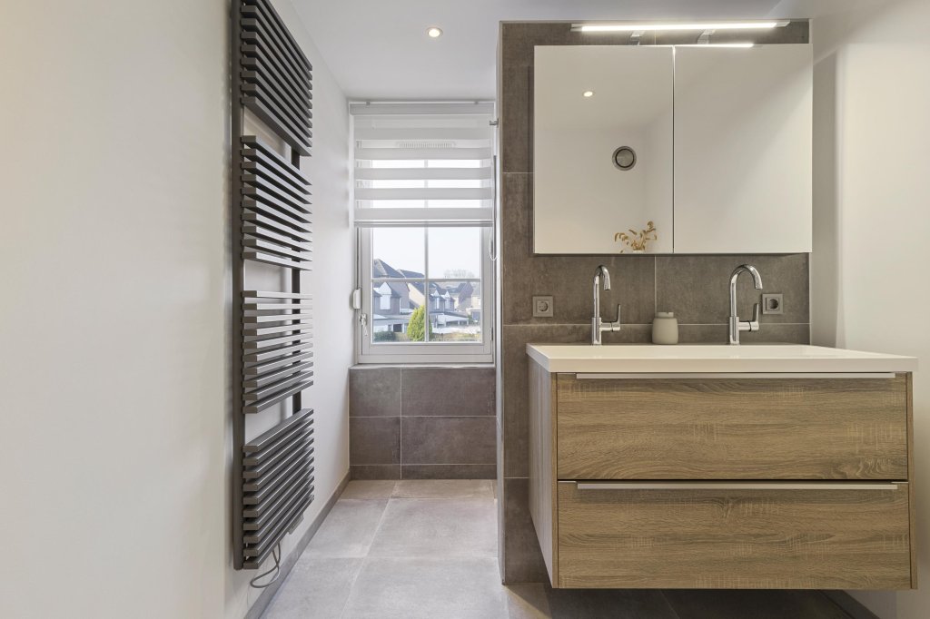 De badkamer vernieuwd in 2019 is modern, strak afgewerkt en ingericht met een royale inloopdouche, een breed wastafelmeubel met dubbele kraan, tweede toilet en elektrische desginradiator.