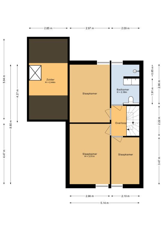 Overloop met toegang tot de drie slaapkamers en de badkamer.