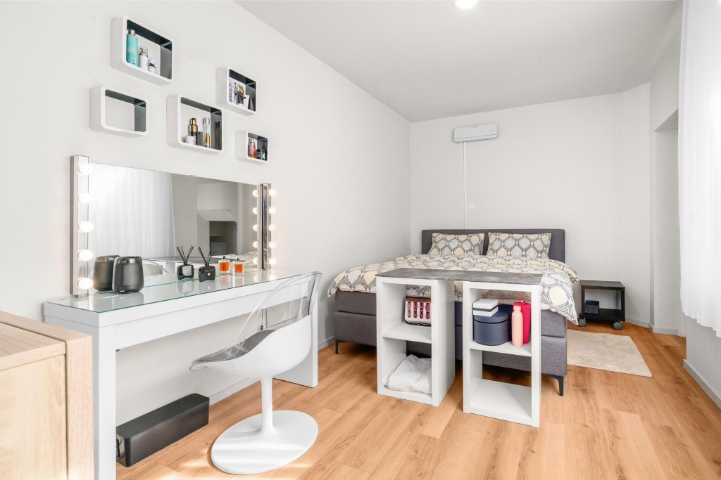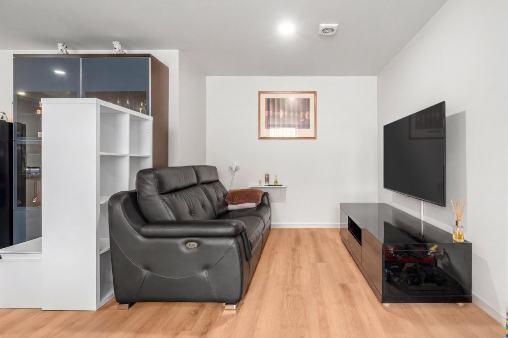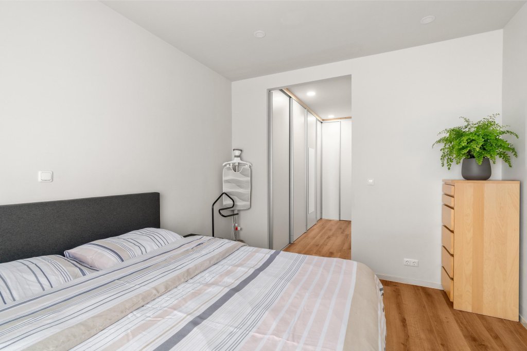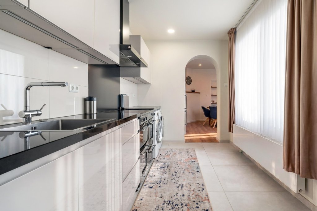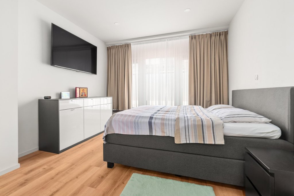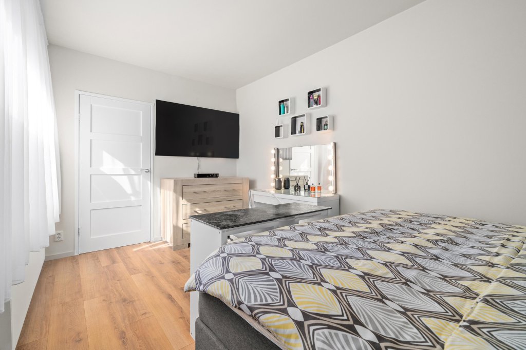 Via de entreehal met meterkast betreedt u een tussenruimte met toegang tot de eerste slaapkamer (ca. 13 m²) met inbouwkastenwand en de living. De woonkamer (met airco) voelt direct prettig aan en vormt samen met de eetkamer een fijne leefruimte. Vanuit de eetkamer is de patiotuin en de keuken te bereiken. De moderne keuken is uitgerust met een vaatwasser en magnetron. Achter de keuken bevindt zich de moderne badkamer met toilet, inloopdouche en wastafel met meubel. Vanuit de woonkamer is een doorloopkamer met inloopkast en de tweede slaapkamer (ca. 21 m²) bereikbaar.