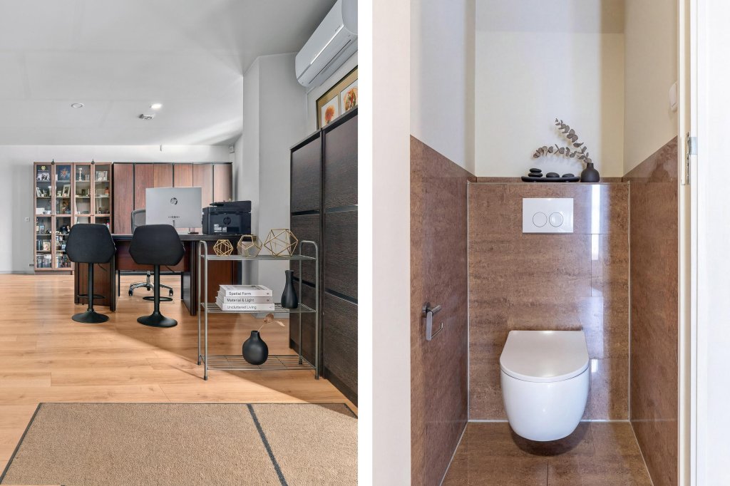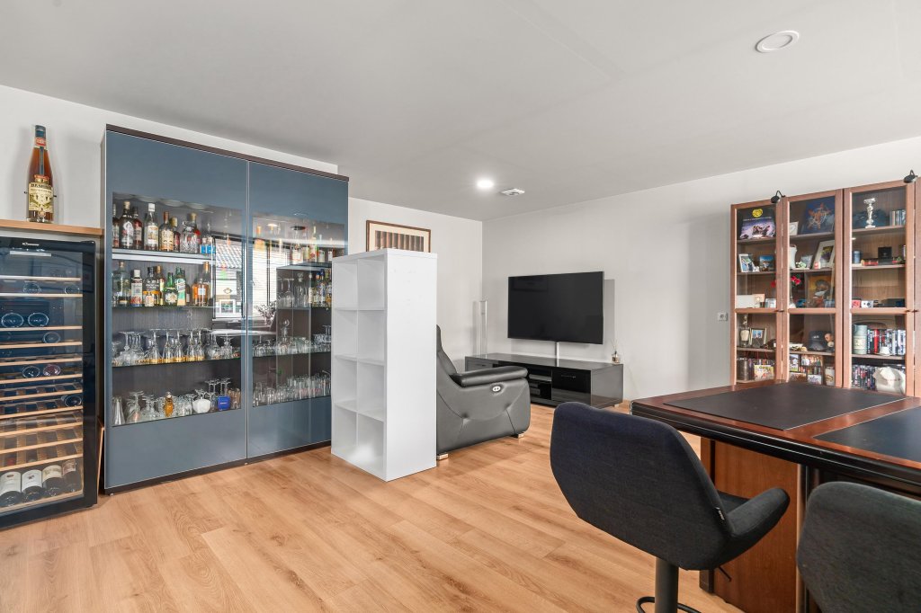 Aan de achterzijde via en tussenportaal is een ruime hobby- / kantoorruimte gecreëerd welke beschikt over een eigen ingang, toiletruimte en keukenblok.