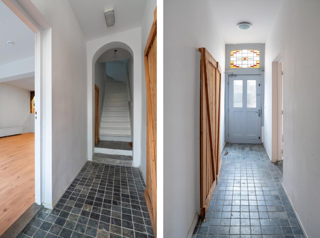 De entree op de begane grond biedt toegang tot een ruime hal met de meterkast. Hier bevindt zich ook de vaste trap die leidt naar de 2 overige appartementen.