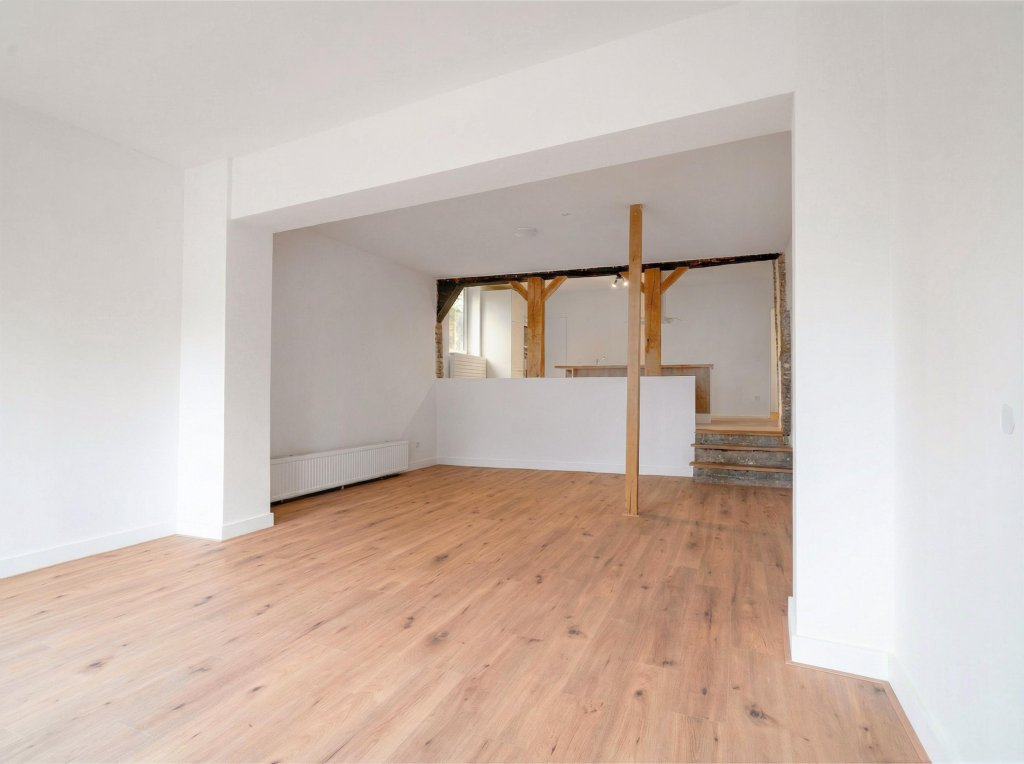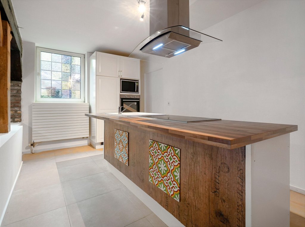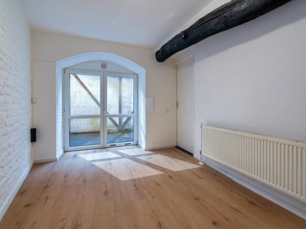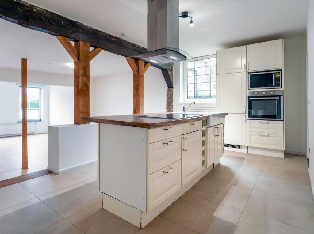 Bij binnenkomst in het appartement betreedt u een lichte en ruime living, die door de authentieke balken zeer sfeervol is. Door enkele traptreden omhoog komt u uit in de royale keuken met kookeiland. De living en keuken zijn voorzien van meerdere ramen, waardoor het een lichte en aangename ruimte is. Kijk ook eens naar onze impressies voor een goed beeld als het appartement is ingericht!