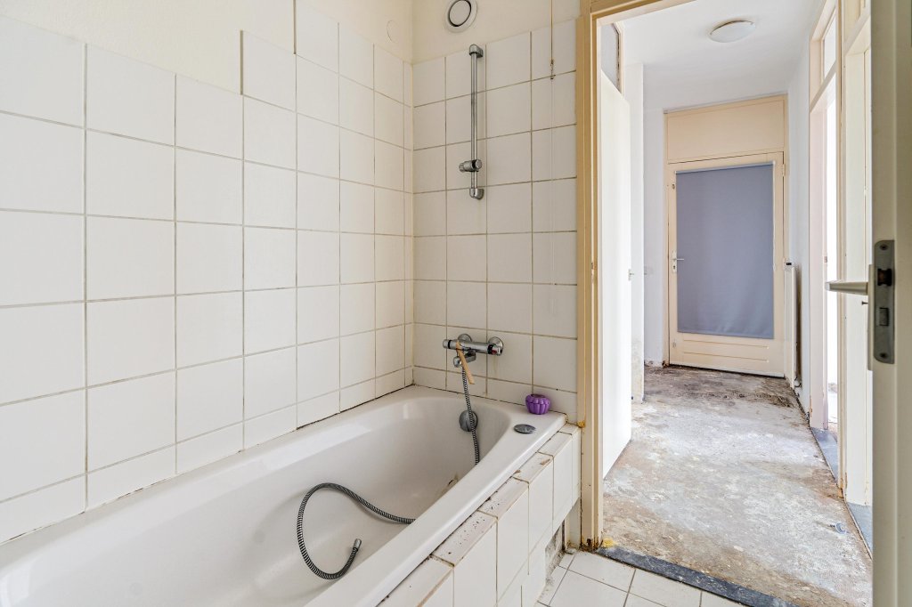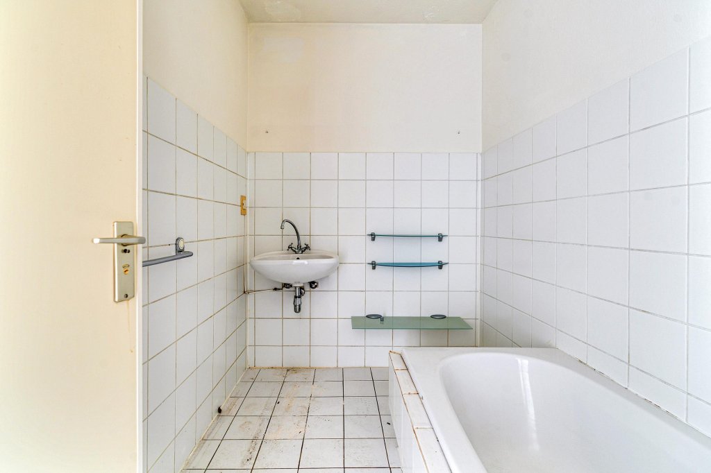 De badkamer is half betegeld en voorzien van een bad-douchecombinatie en een wastafel. Het aparte toilet beschikt over een fonteintje.