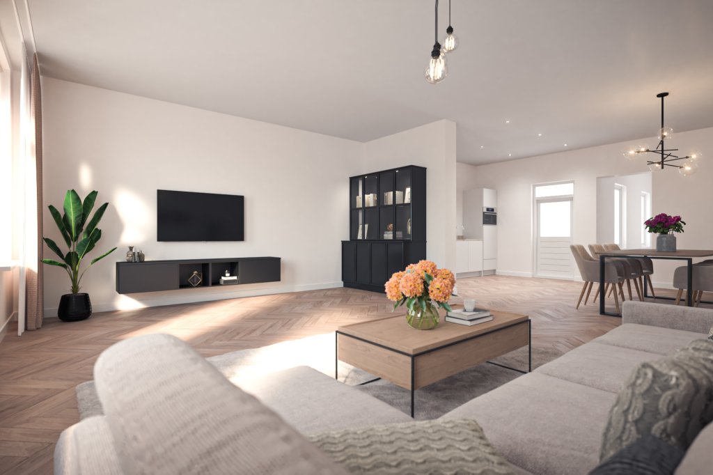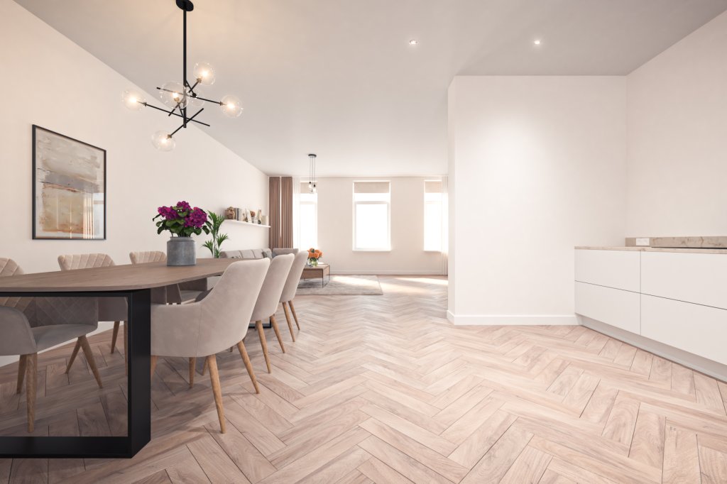 Deze verdieping wordt volledig gerenoveerd tot een luxe leefruimte met een moderne uitstraling. De lichte woonkamer sluit prachtig aan op een half open, stijlvolle keuken met kookeiland.