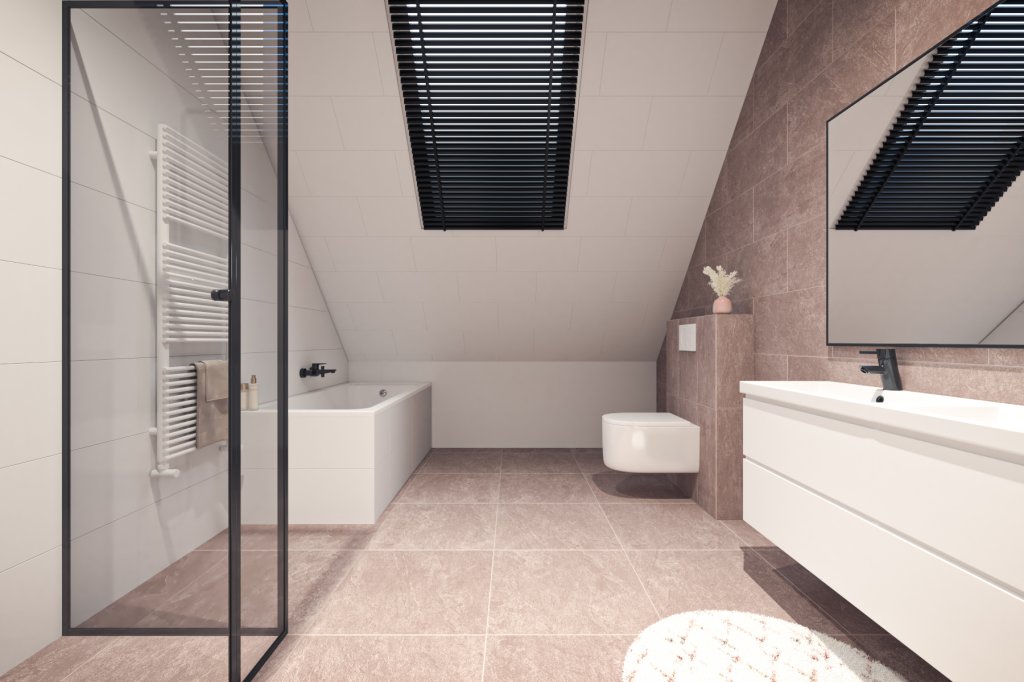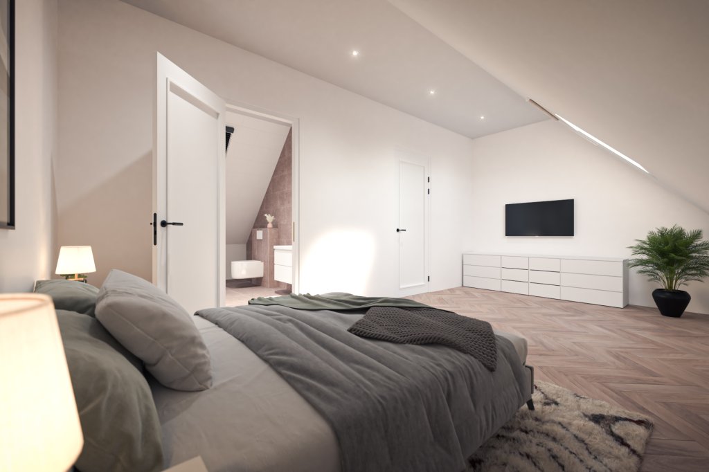 De bovenste verdieping wordt getransformeerd tot een indrukwekkende, loftachtige ruimte die luxe en comfort uitstraalt. Hier bevindt zich de masterbedroom, met als eyecatcher een vrijstaand bad dat direct zorgt voor een gevoel van hotelklasse.