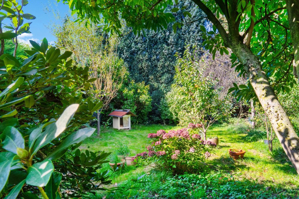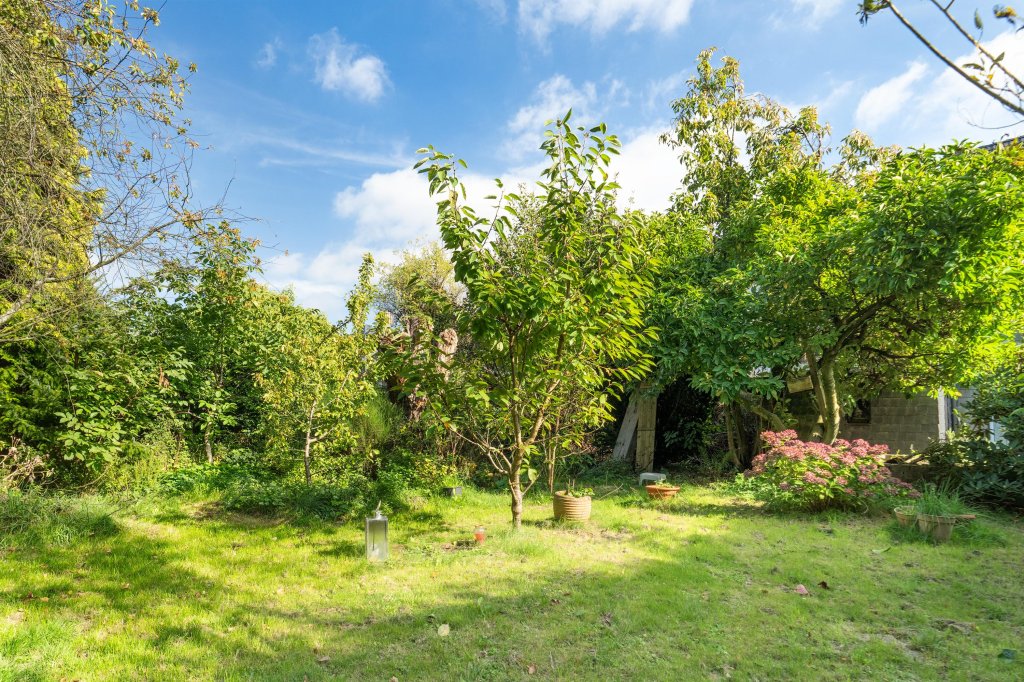 De diepe achtertuin heeft een bosrijk en groen karakter, met volwassen beplanting en veel privacy.
