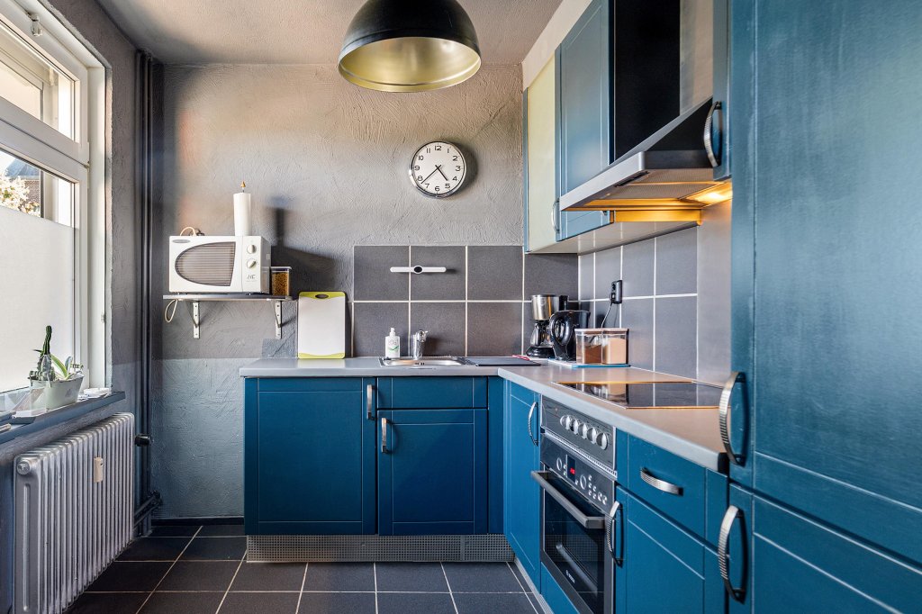 Aan de linkerkant bevindt zich de betegelde keuken, uitgerust met een wasbak, oven, 4-pits inductiekookplaat, afzuigkap, koelkast en zowel boven- als onderkasten. Ook is er een aansluiting voor een vriezer aanwezig. De keuken beschikt over een handmatig rolluik.