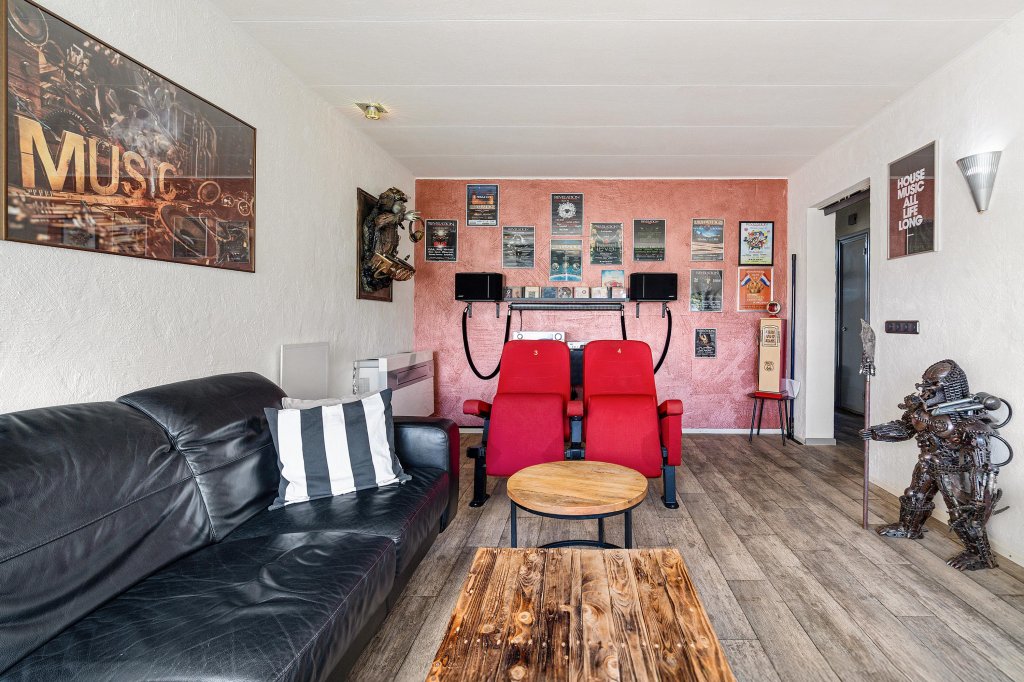 Rechts van de hal vindt u de lichte woonkamer, eveneens voorzien van een laminaatvloer, monoblock airco en uitzicht op de Markt.