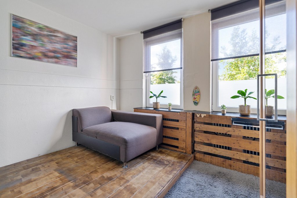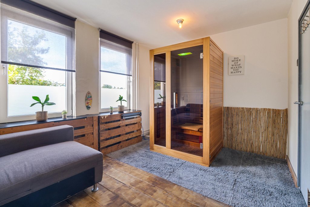 Daarnaast is er nog een extra ruimte, afgewerkt met deels vloerbedekking en deels houten plinten, die toegang biedt tot een ruimte met infraroodsauna.