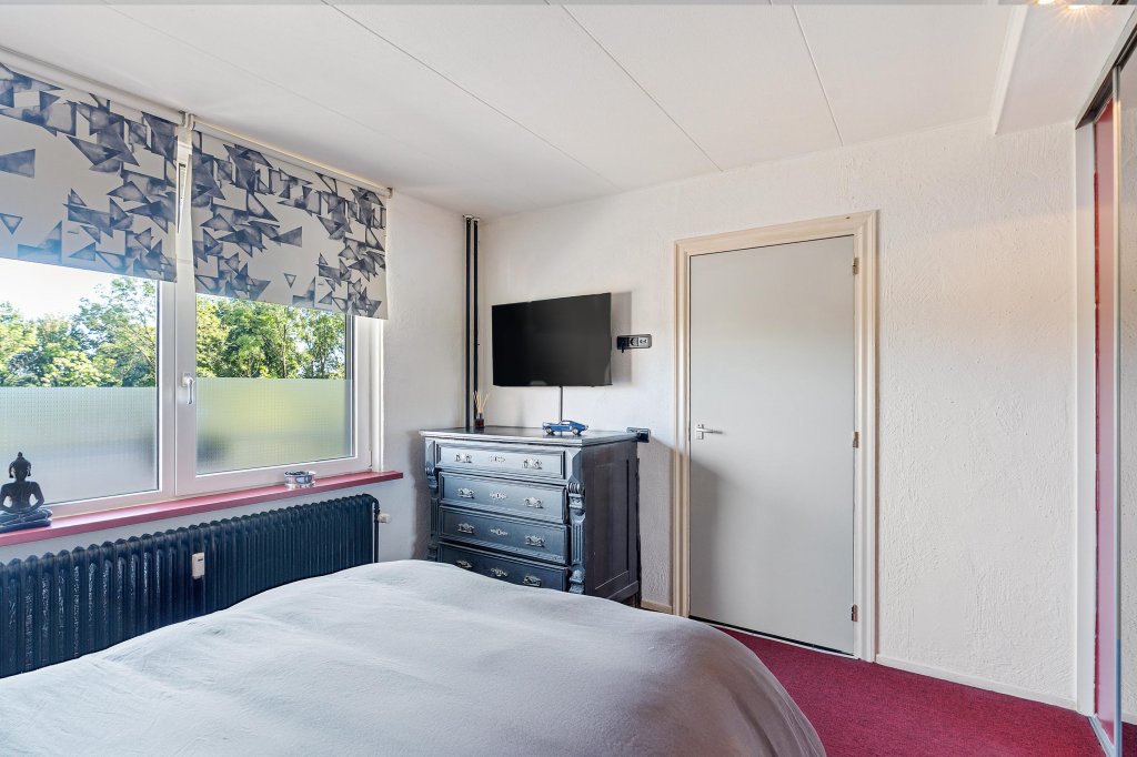 De slaapkamer beschikt over vloerbedekking, een ingebouwde kast en een handmatig rolluik. Hier heeft u uitzicht op de achterzijde van het complex.