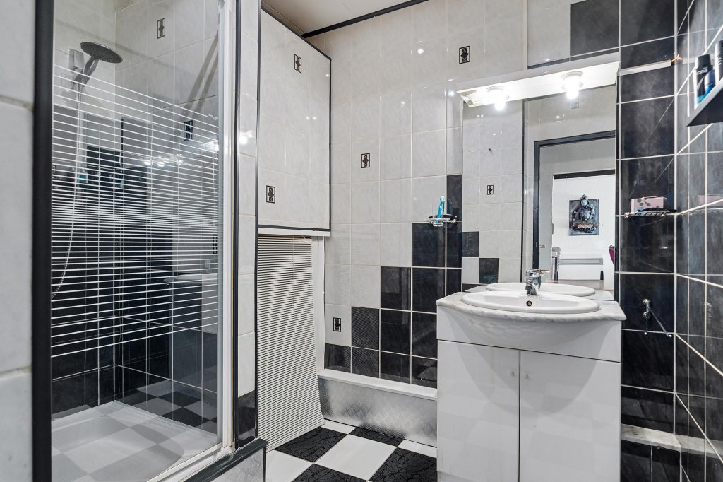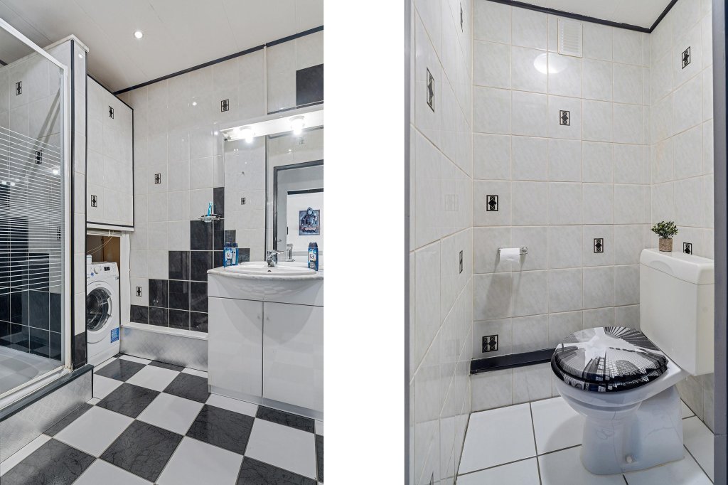 De badkamer is volledig betegeld en voorzien van een wastafel met meubel, douche en witgoedaansluiting. Separaat vindt u het eveneens volledig betegelde toilet.
