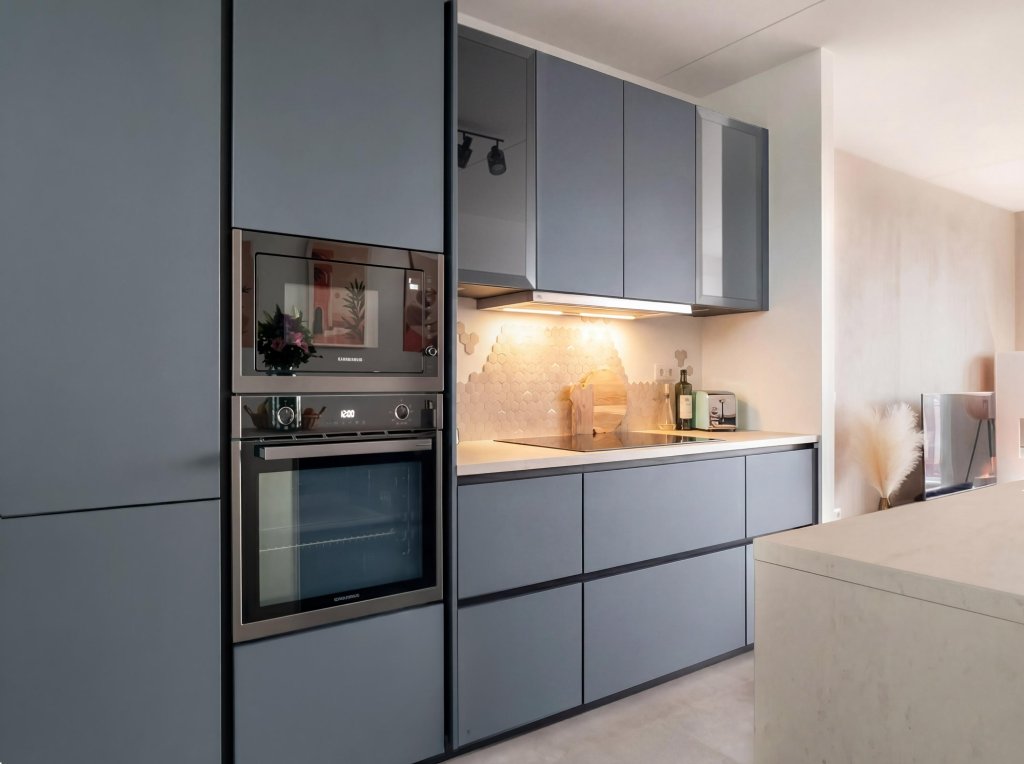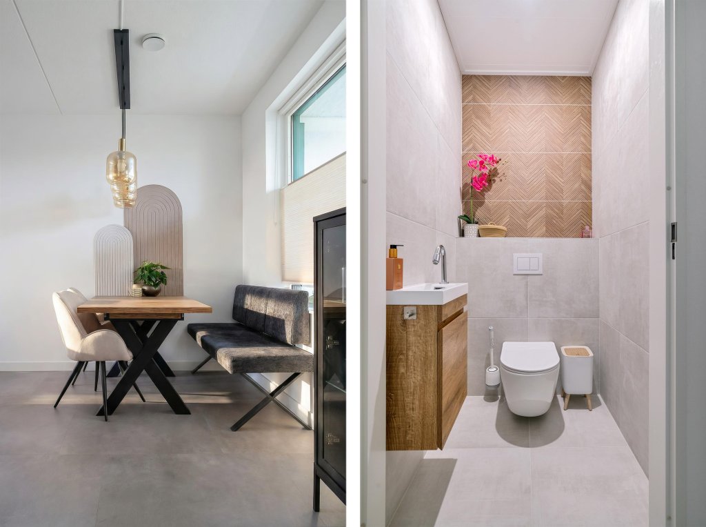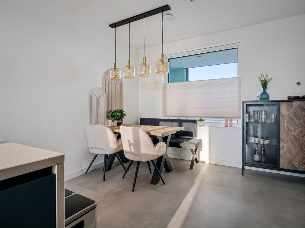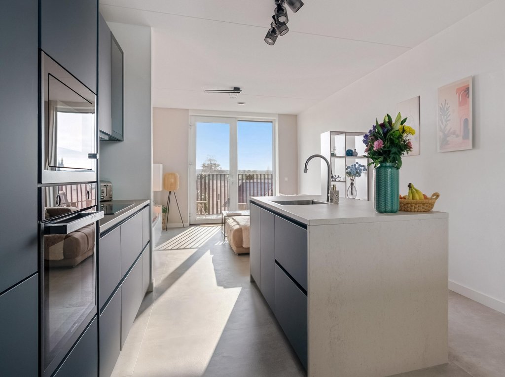 Bij binnenkomst valt direct de strakke en moderne afwerking op. De hal biedt toegang tot het zwevende toilet met fonteintje en de praktische wasruimte. De royale woon-/eetkamer vormt het hart van het appartement en is heerlijk licht dankzij de grote raampartijen. Centraal in de ruimte bevindt zich de exclusieve open keuken met kookeiland – een echte blikvanger. Deze is uitgerust met hoogwaardige inbouwapparatuur en nodigt uit tot koken, borrelen en tafelen in stijl. Via de woonkamer bereikt u het balkon aan de achterzijde: een fijne plek om in alle rust te genieten van een kop koffie in de ochtendzon of een ontspannen avond na een drukke dag.
