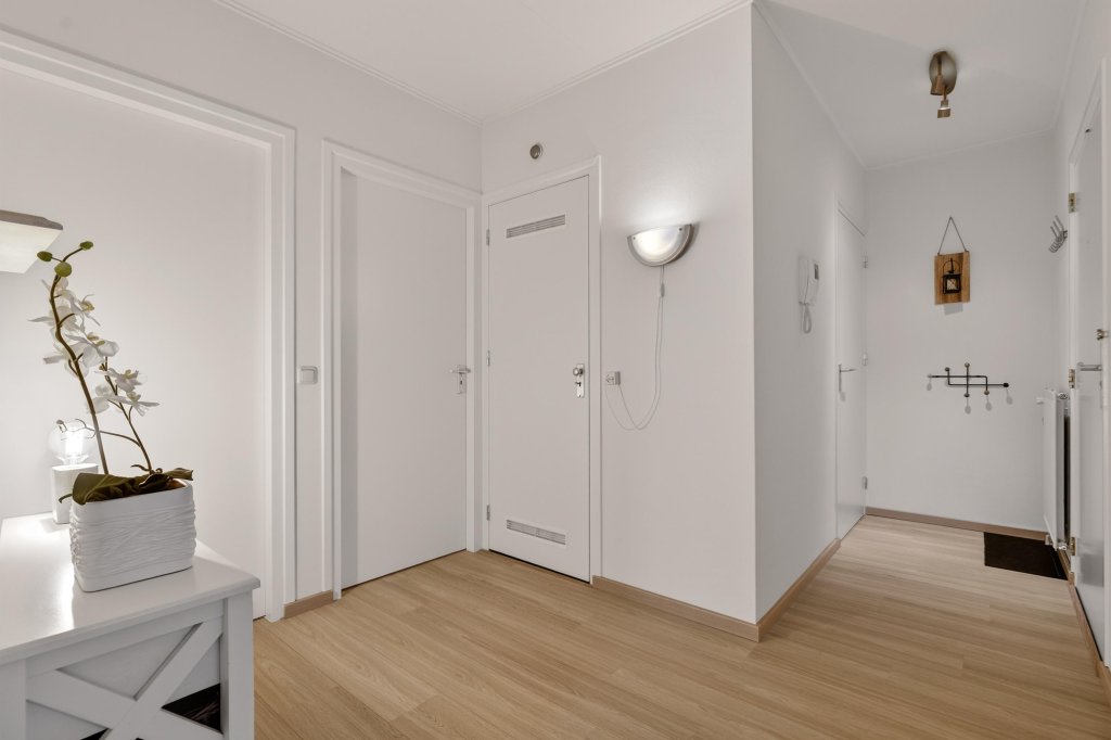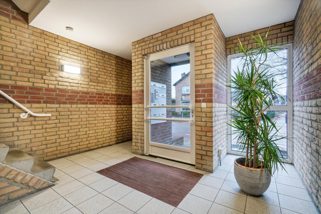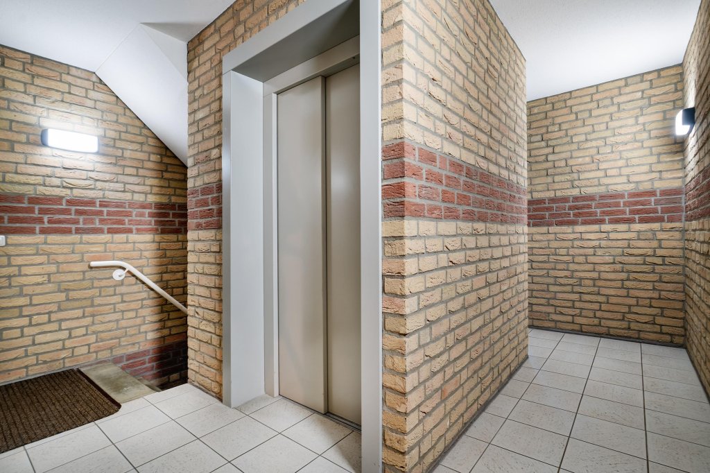 Gemeenschappelijke overdekte entree met bellentableau en brievenbussen. Hal met liftinstallatie en trappenhuis.