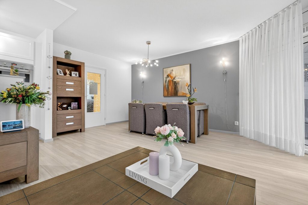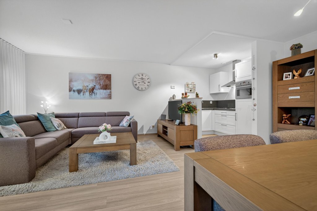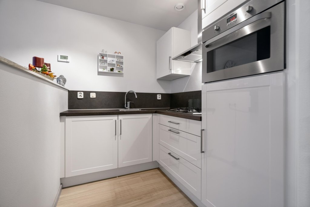 Woonkamer met een laminaatvloer verdeeld in een open keuken en een zit- en eetgedeelte. De open keuken is voorzien van een nette installatie in hoekopstelling en heeft de navolgende apparatuur; 4-pits gaskookplaat, koelkast met diepvries, afzuigkap en combi-oven.