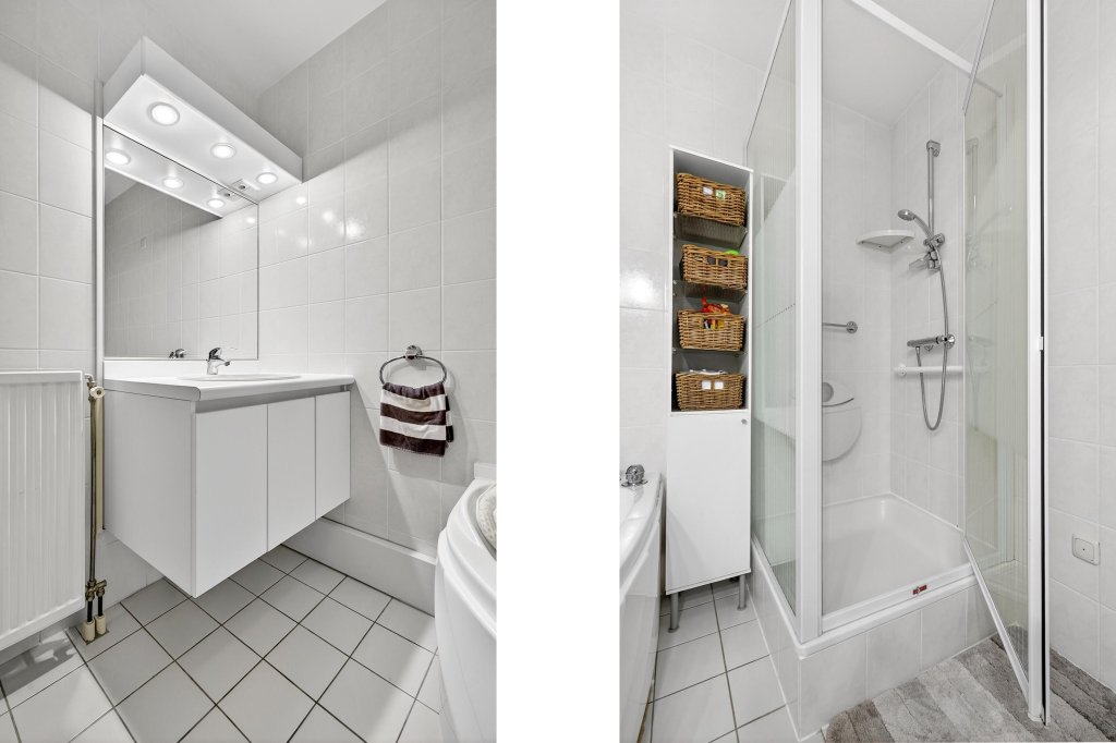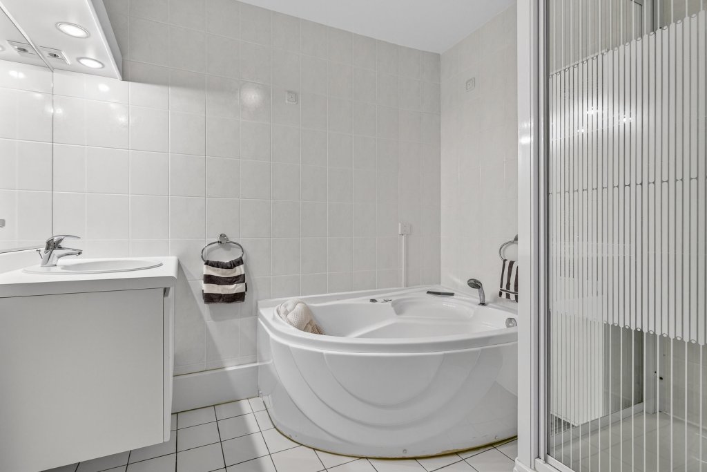 De badkamer is geheel betegeld en compleet ingericht met jacuzzi, douche en badmeubel met vaste wastafel.