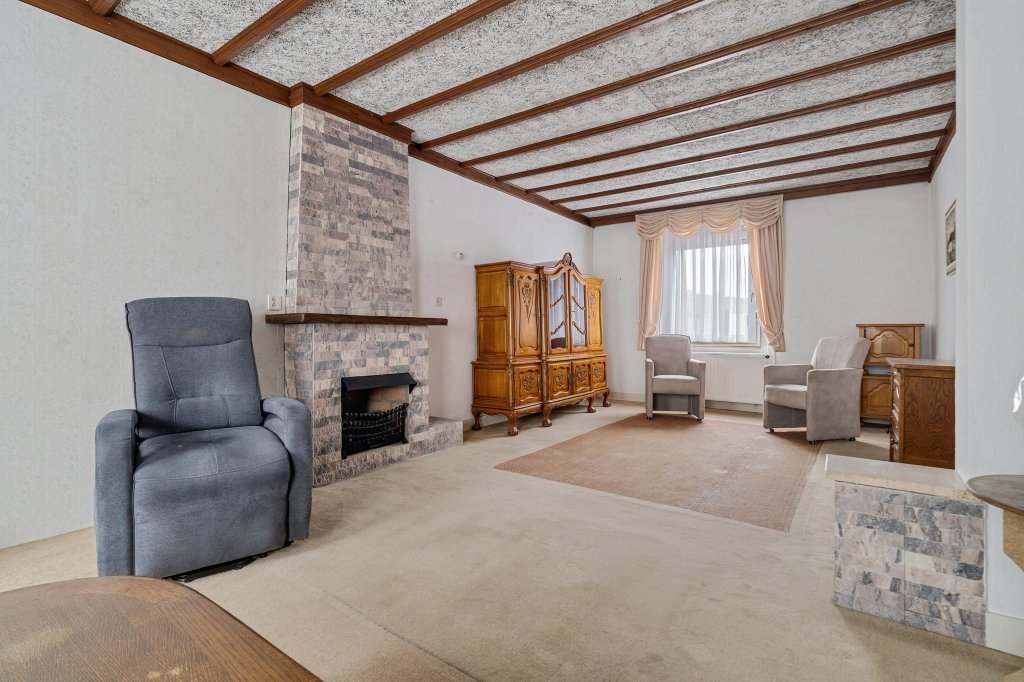 De woonkamer beschikt over vloerbedekking, een gezellig zitgedeelte en een sfeervolle open haard.