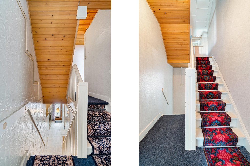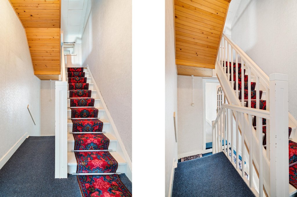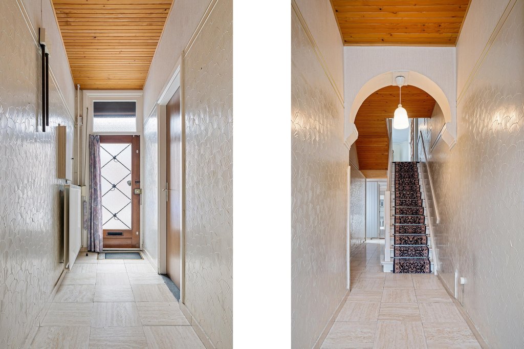 De entreehal is betegeld en biedt toegang tot de meterkast, de woonkamer, de keuken, de vaste trap naar de kelder, de vaste trap naar de eerste verdieping en de tuin.