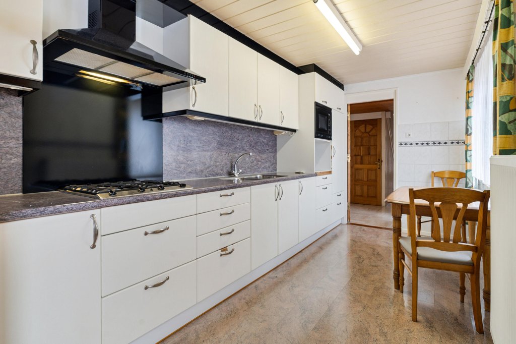 De keuken is uitgerust met boven- en onderkasten, een afzuigkap, 4-pits gasfornuis, wasbak, combimagnetron, koelkast en een klein eetgedeelte. Vanuit de keuken heb je toegang tot de badkamer en tot de tuin.