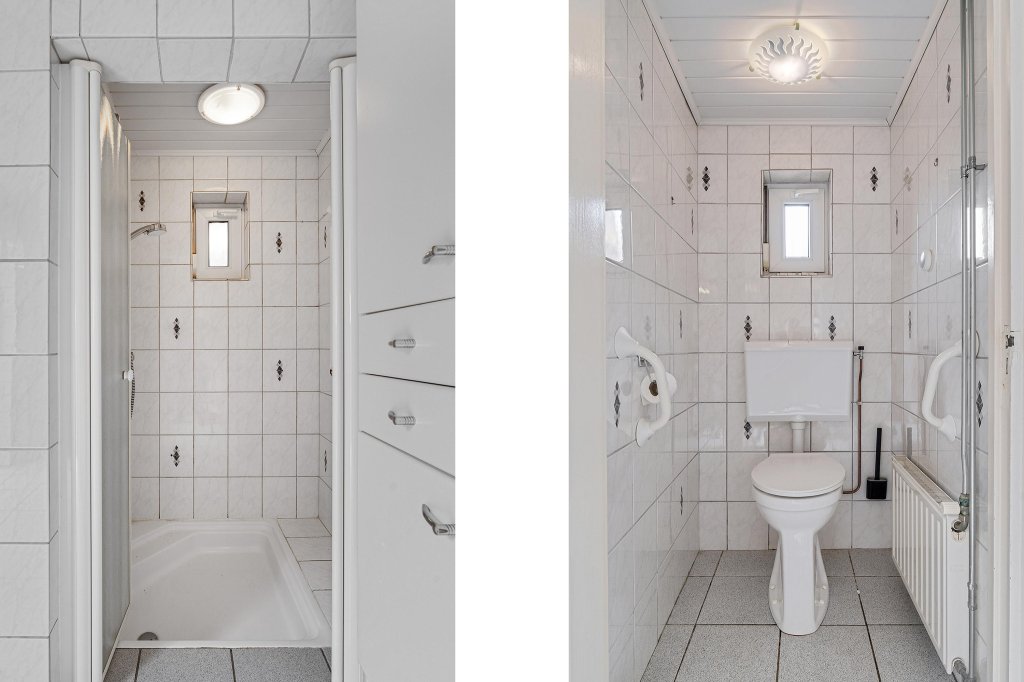 De badkamer is volledig betegeld en voorzien van een wastafel, toilet en inloopdouche. Vanuit de badkamer stap je rechtstreeks de tuin in.