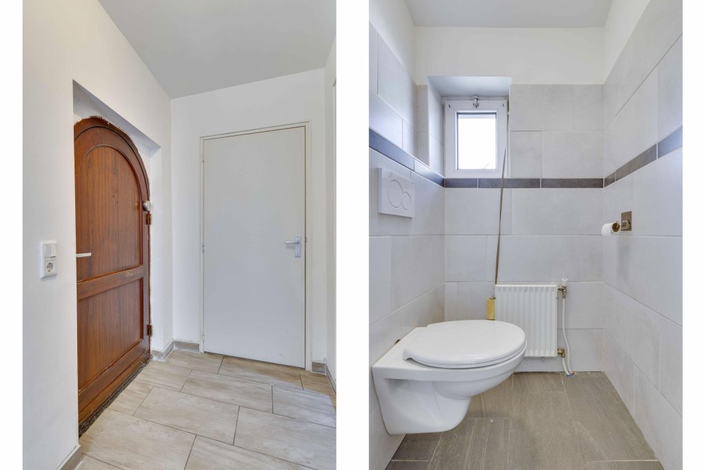 Hal/entree met tegelvloer, meterkast en een betegelde toiletruimte voorzien van een zwevend closet.