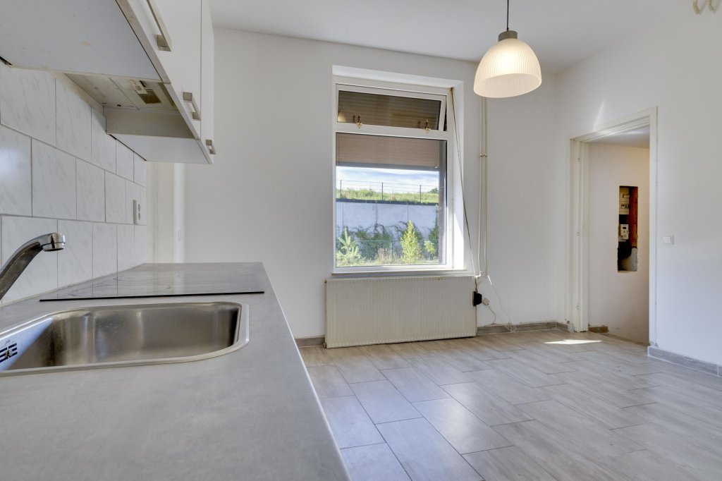 De aangrenzende keuken is voorzien van een eenvoudig keukenblok en tegelvloer.