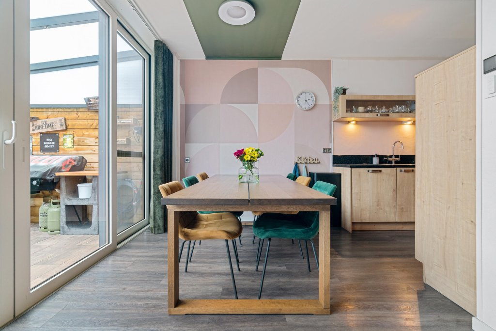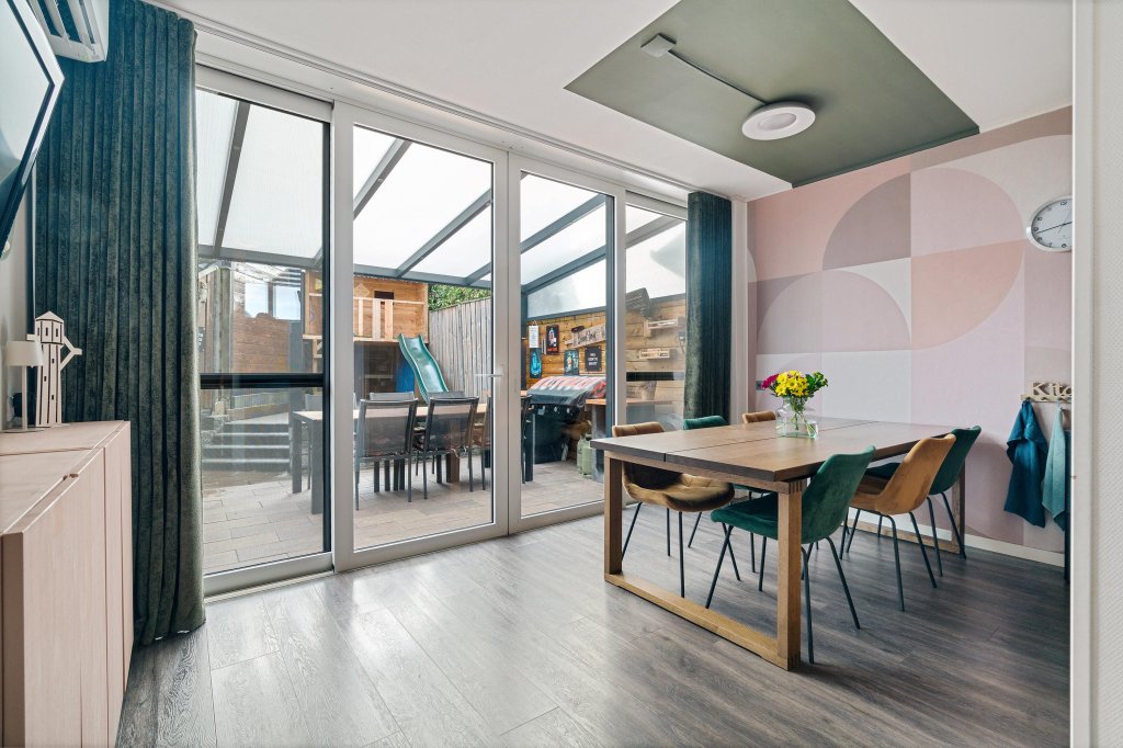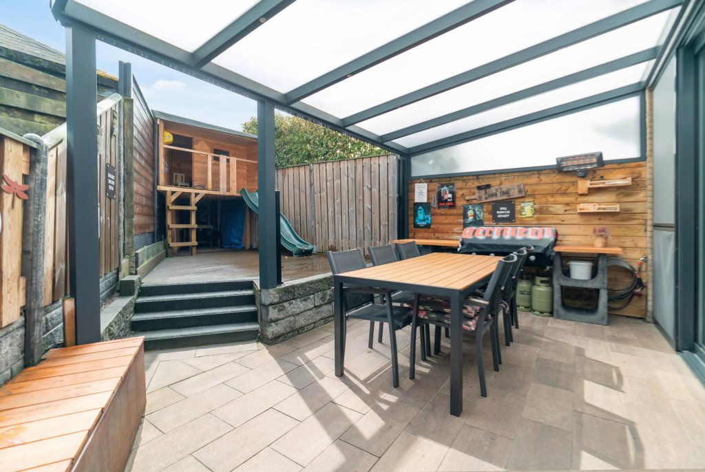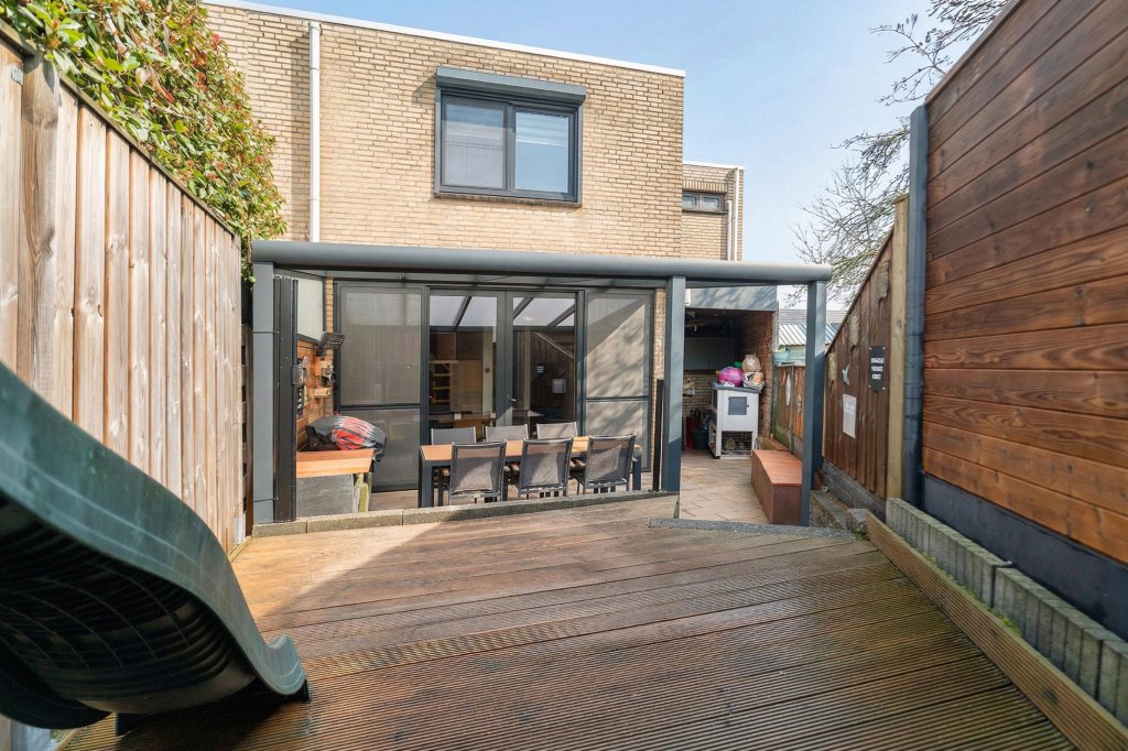 Via de schuifpui in de leefkeuken heeft u toegang tot de complete onderhoudsarme tuin en beschikt over een terras met overkapping, vlonder en speelhuis.