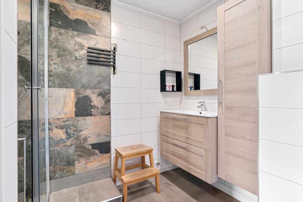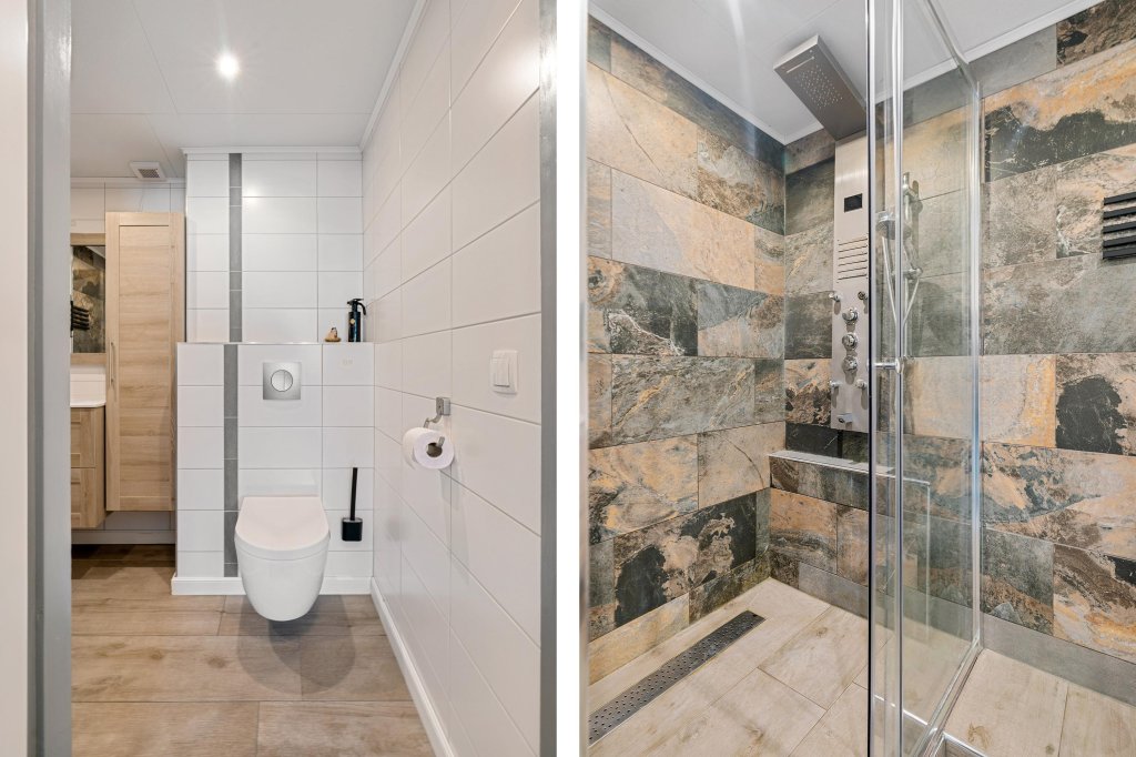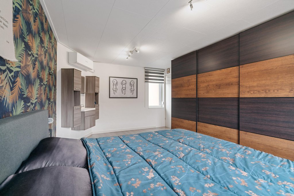 Op deze verdieping vindt u 2 slaapkamers, allen met laminaatvloer en luxe badkamer aan. De slaapkamer aan de voorzijde beschikt over een airco voor aangenaam comfort en een badmeubel met vaste wastafel. De luxe betegelde badkamer is voorzien van een toilet, inloopdouche en een dubbele wastafel met meubel.