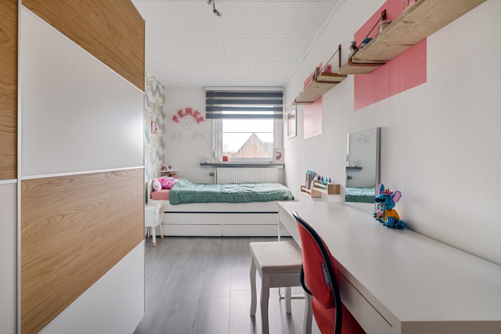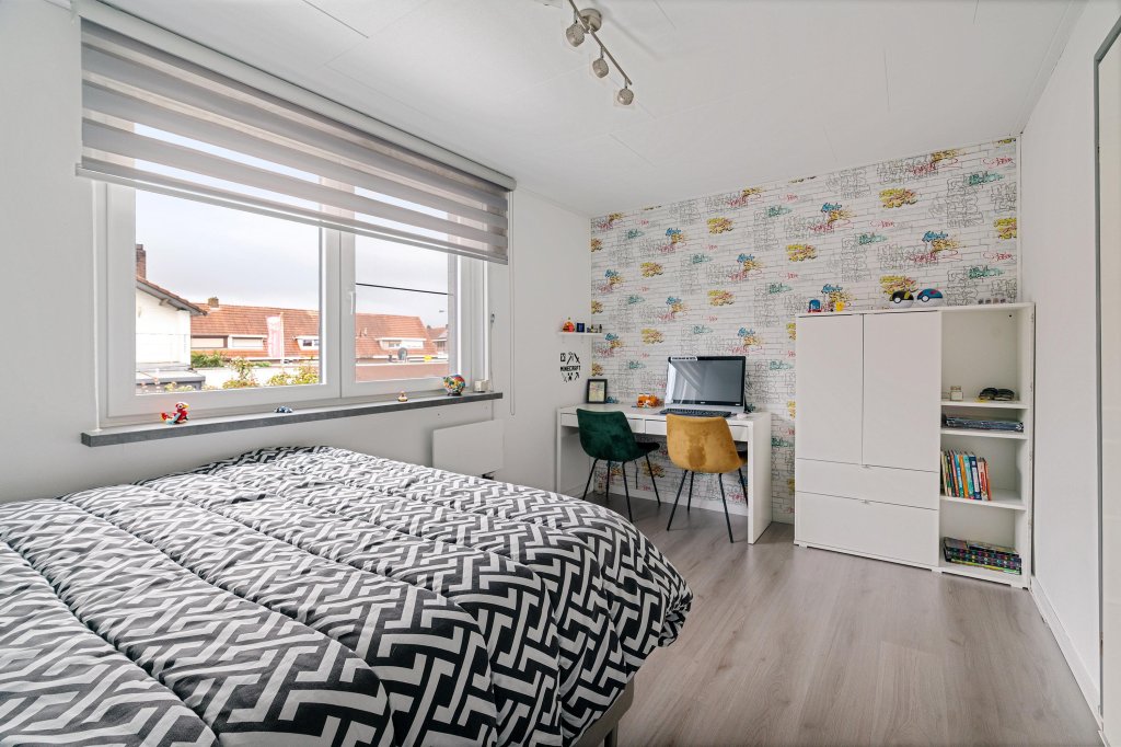Op de bovenste verdieping bevindt zich een overloop met diepe bergkast en toegang tot twee ruime slaapkamers Beide slaapkamers beschikken over een laminaatvloer.