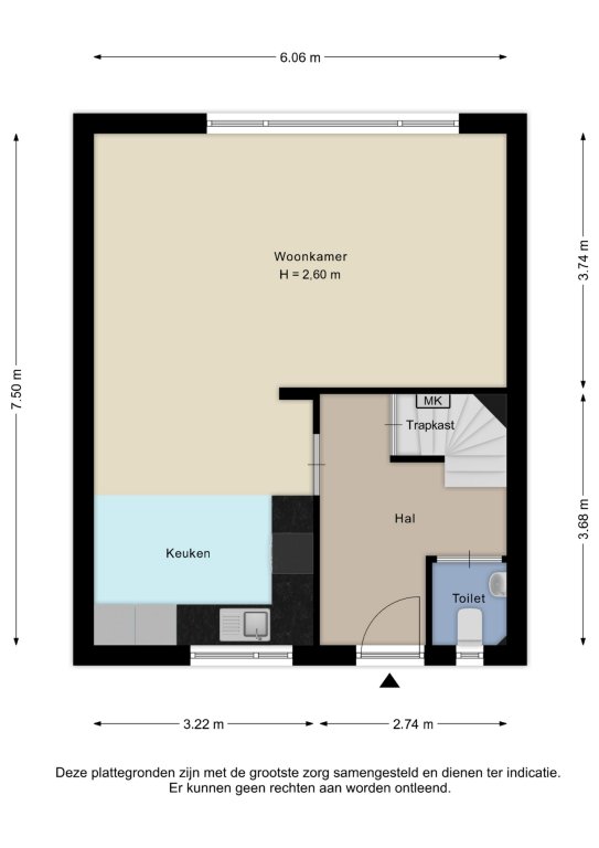Alle door ons kantoor verstrekte informatie omtrent onroerende zaken, moet beschouwd worden als een uitnodiging om in onderhandeling te treden, en is geheel vrijblijvend! Alle vermelde maten en afmetingen zijn slechts bij benadering. Aan deze beperkte informatie kunnen geen rechten worden ontleend. Indien in enige documentatie of op enige website informatie staat die niet overeen komt met de werkelijkheid, dan geldt de feitelijke situatie waarin de woning zich bevindt, zoals koper deze tijdens de bezichtiging heeft kunnen waarnemen, en wordt de woning in deze feitelijke situatie/staat verkocht. Een (eventueel) bijgevoegde plattegrond dient uitsluitend als globale indicatie/visualisatie. Hieraan kunnen uitdrukkelijk geen rechten worden ontleend.
