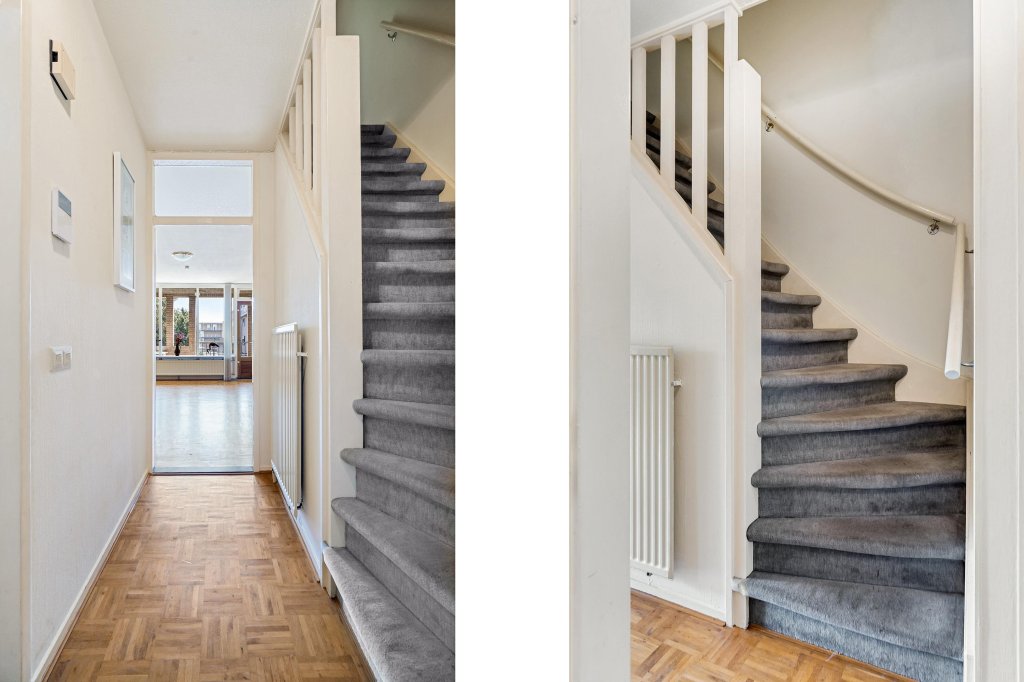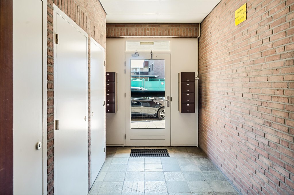 Centrale entree met bellentableau en video-intercominstallatie; ontvangsthal met toegang tot het trappenhuis; meterkast en toegang tot de eerste verdieping. De privé berging (ca. 6 m²) en parkeerplaats is bereikbaar via een afgesloten poort vanaf het ruime parkeerterrein.