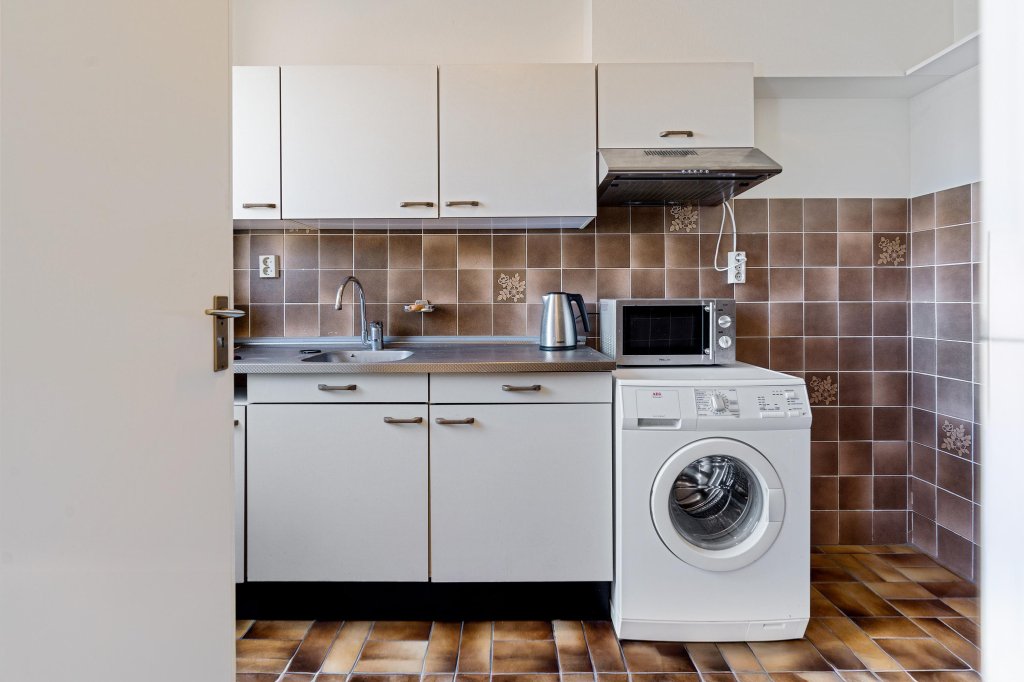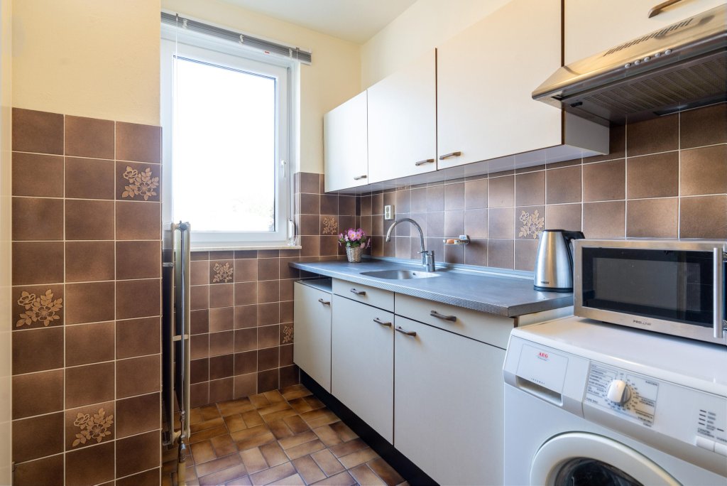 De aangrenzende gesloten keuken (ca. 6 m²) beschikt over een tegelvloer en een eenvoudig keukenblok. Hier vindt u alles wat nodig is om direct aan de slag te kunnen, met ruimte om desgewenst te moderniseren.