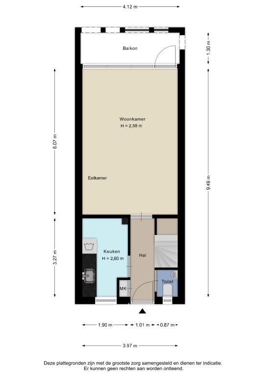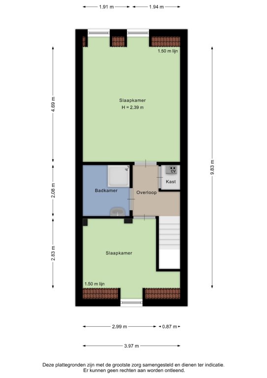 Alle door ons kantoor verstrekte informatie omtrent onroerende zaken, moet beschouwd worden als een uitnodiging om in onderhandeling te treden, en is geheel vrijblijvend! Alle vermelde maten en afmetingen zijn slechts bij benadering. Aan deze beperkte info kunnen geen rechten worden ontleend. Indien in enige documentatie of op enige website informatie staat die niet overeen komt met de werkelijkheid, dan geldt de feitelijke situatie waarin de woning zich bevindt, zoals koper deze tijdens de bezichtiging heeft kunnen waarnemen, en wordt de woning in deze feitelijke situatie/staat verkocht. Een (eventueel) bijgevoegde plattegrond dient uitsluitend als globale indicatie/visualisatie. Hieraan kunnen uitdrukkelijk geen rechten worden ontleend.