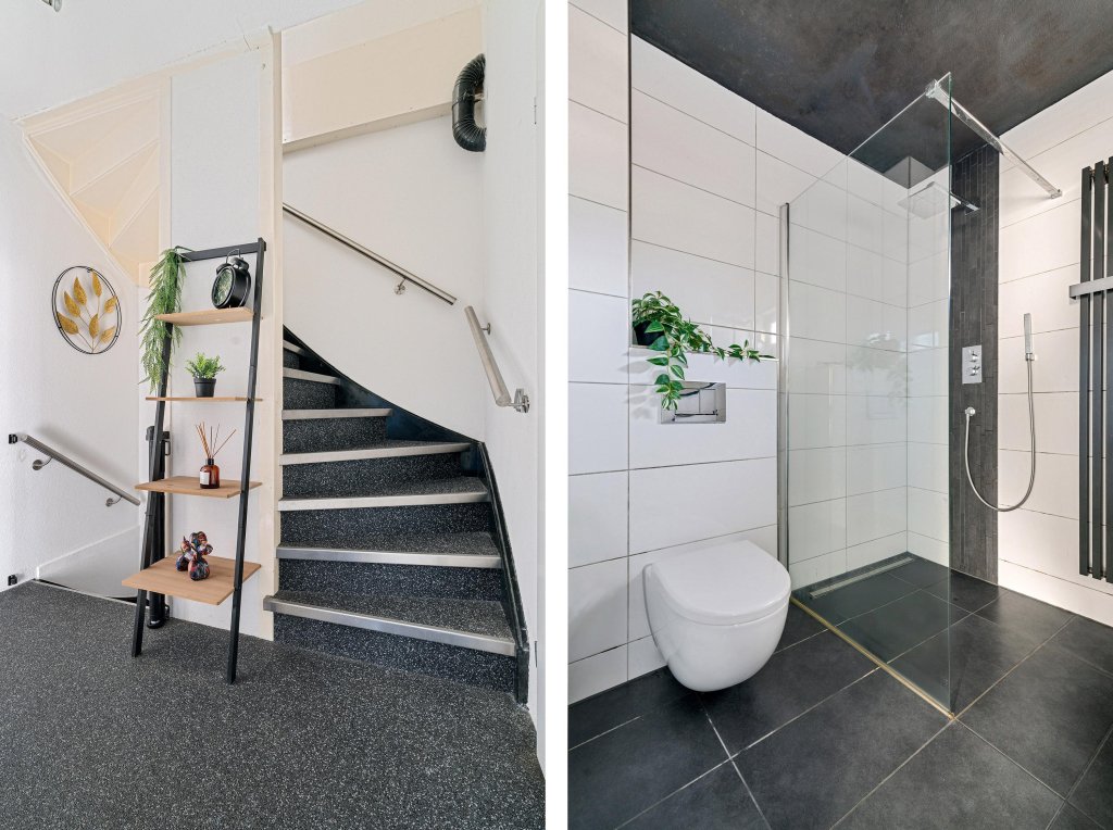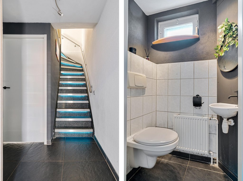 Bij binnenkomst betreedt u de hal, die toegang biedt tot de moderne meterkast, toilet en vaste trap naar de eerste verdieping.