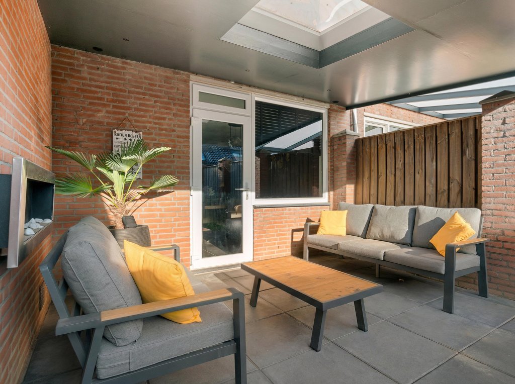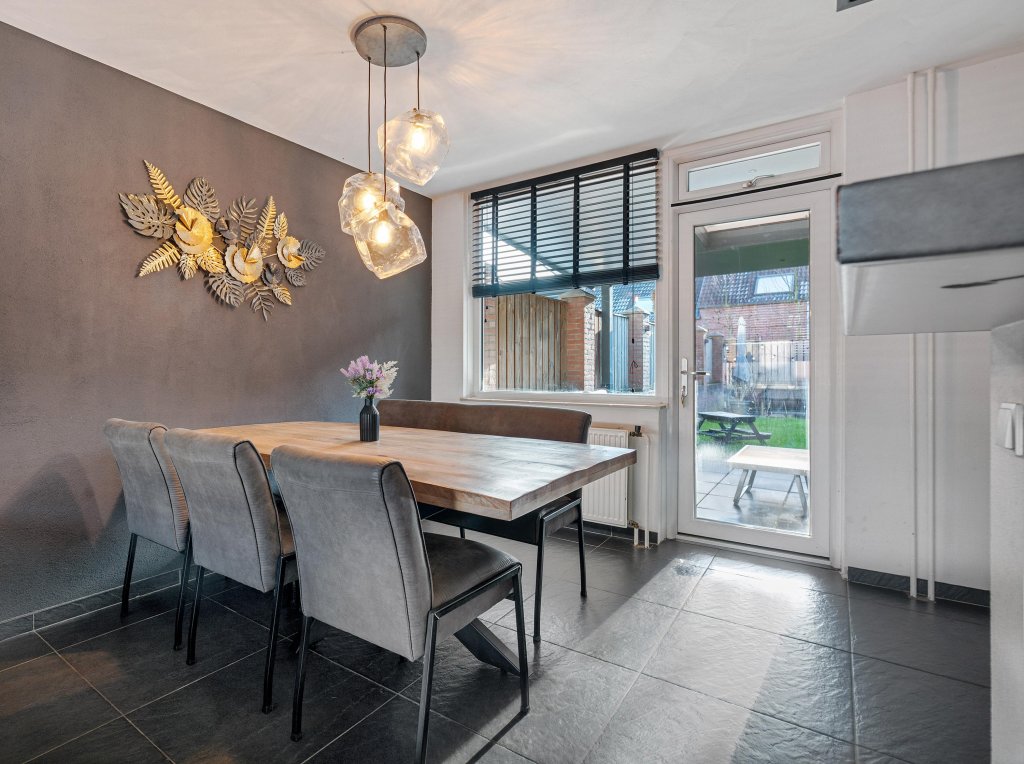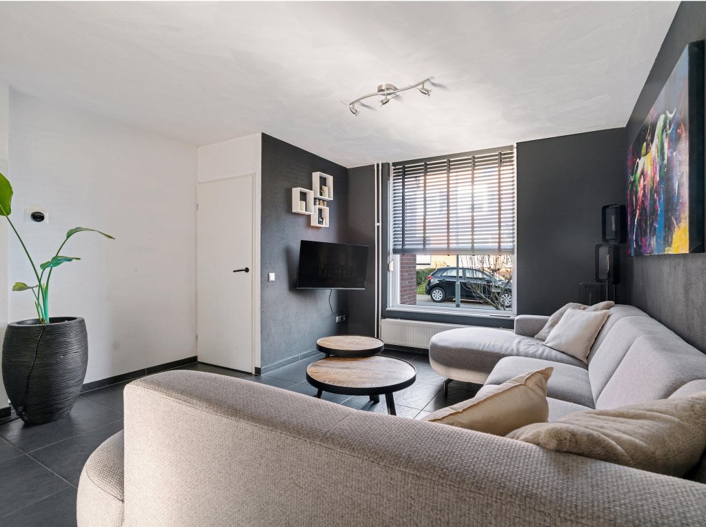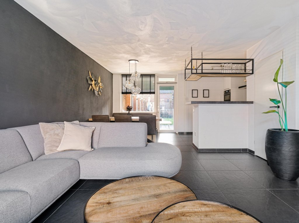 De woonkamer met doorlopende plavuizenvloer is ingericht met een woon en zitgedeelte en staat in open verbinding met de moderne keuken, die van alle gemakken is voorzien: Inductie, afzuigkap, vaatwasser, combi-oven en koelkast. De woonkamer is eveneens verbonden met de fraaie tuin met ruime overkapping en berging.