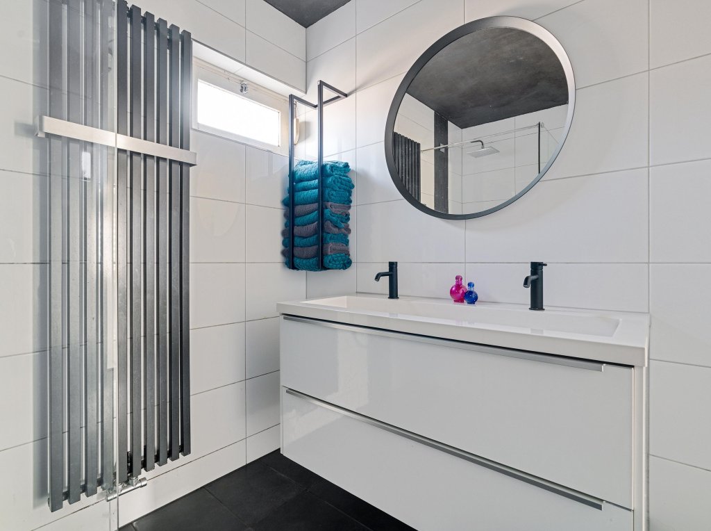 Op de eerste verdieping vindt u drie ruime slaapkamers, allen met grindvloer en handmatige rolluiken. De luxe betegelde badkamer is voorzien van een toilet, inloopdouche met regendouche en een dubbele vaste wastafel met meubel. Vanuit de overloop is tevens via een vaste trap de tweede verdieping bereikbaar.