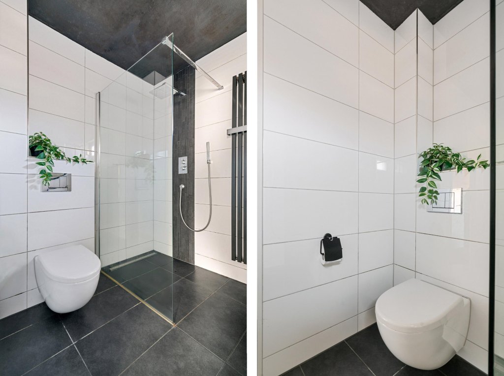 Het toilet is volledig betegeld en voorzien van een hangend closet en fonteintje.