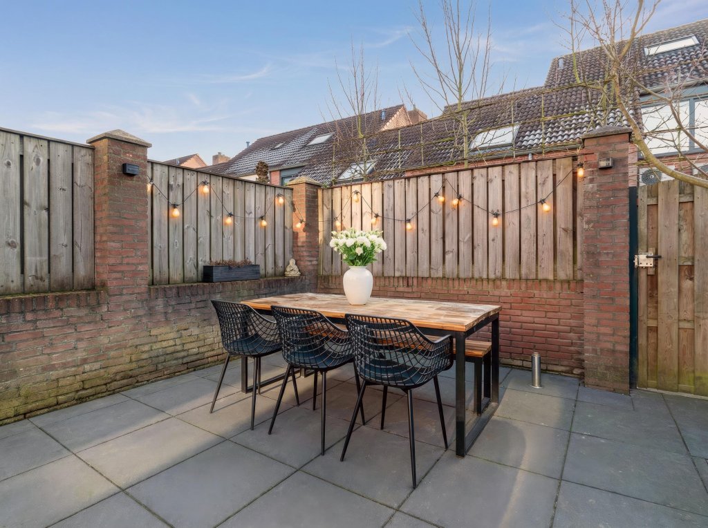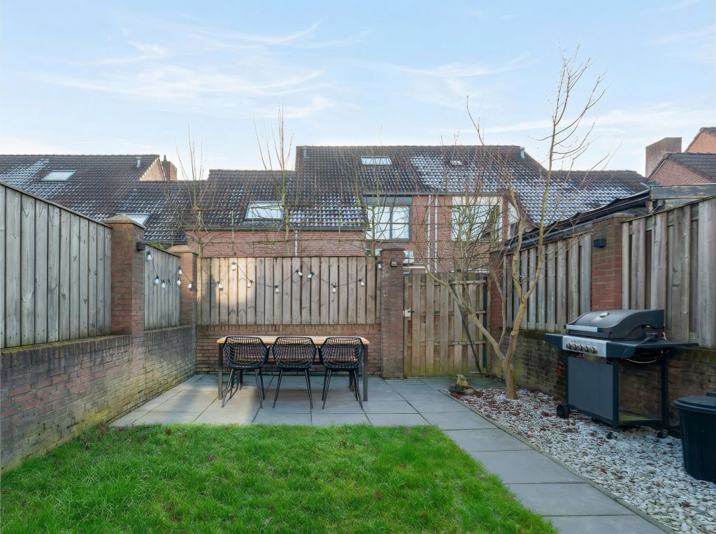 De voortuin is onderhoudsvrij en voorzien van een pad. De achtertuin is fraai ingericht met een ruime overkapping met zitgedeelte, gazon, borders, berging en een extra zonneterras. Aan de achterzijde van de woning is een pad gelegen.