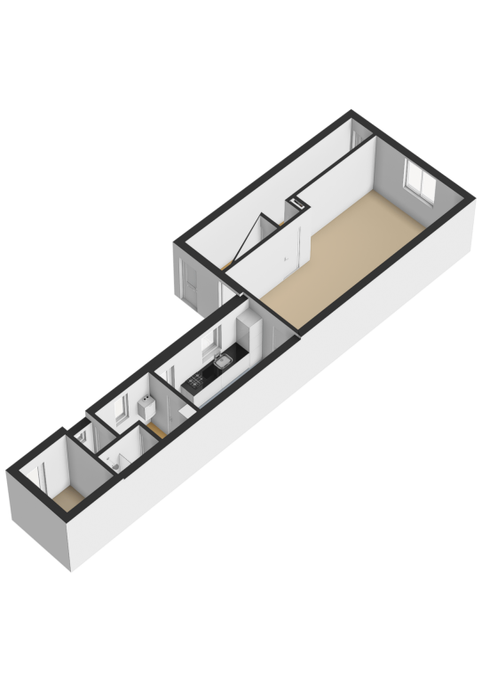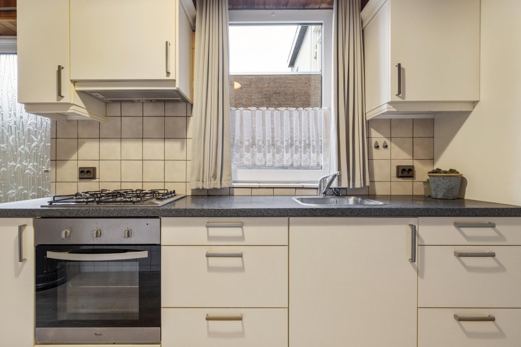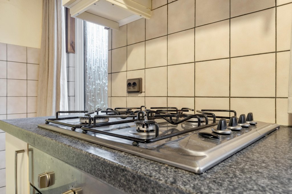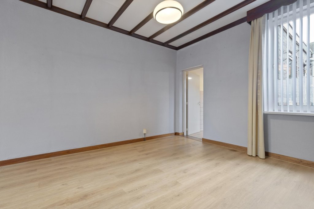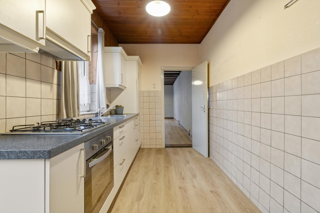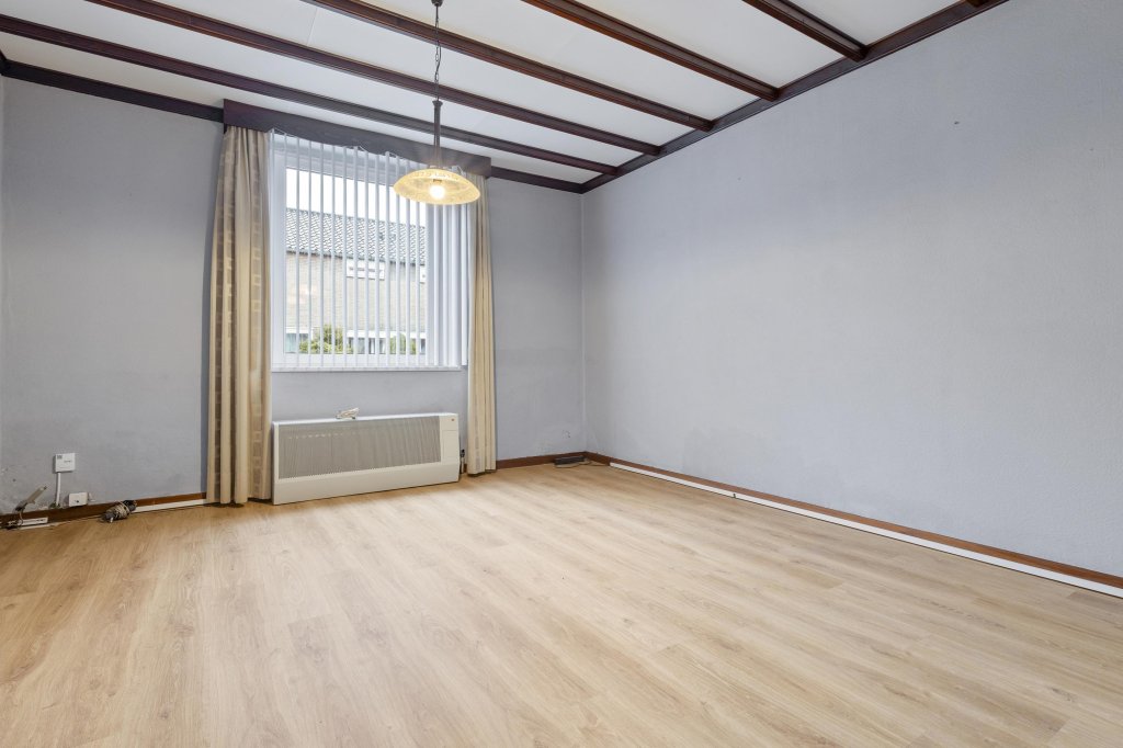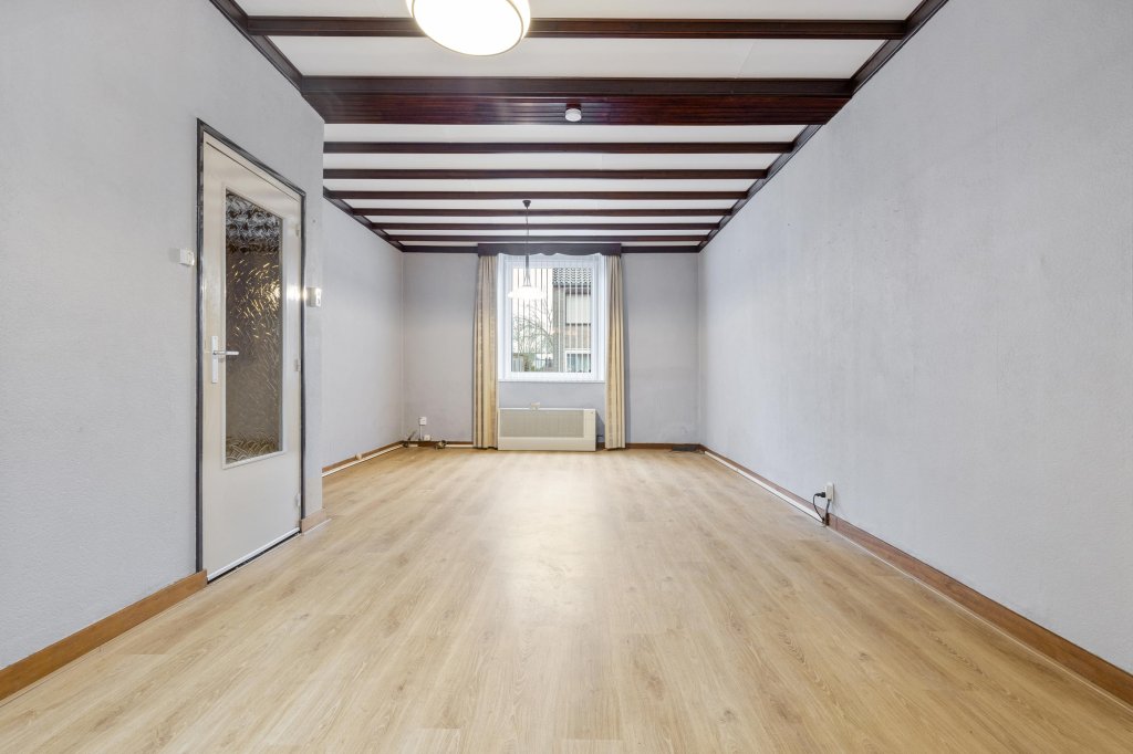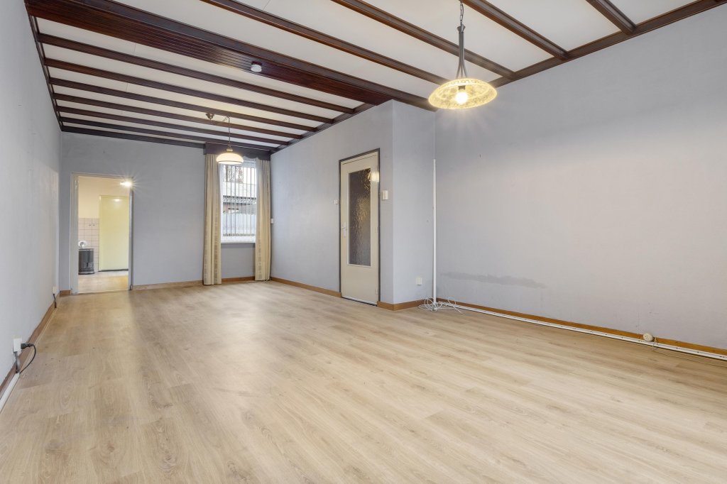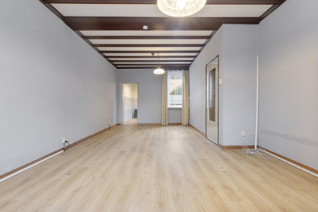 Ruime doorzonwoonkamer met toegang tot de gesloten keuken. De keuken is voorzien van de navolgende inbouwapparatuur: 4 pits gaskookplaat en afzuigkap. Via de keuken is er toegang naar de toiletruimte, de badkamer en berging.