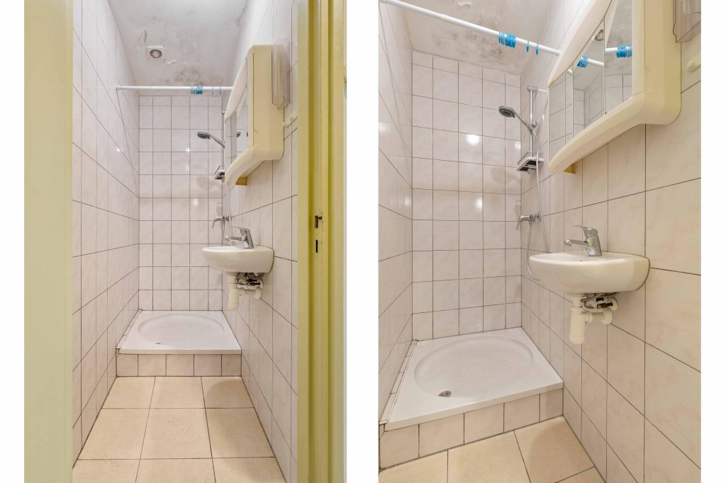 De volledig betegeld badkamer is voorzien van een wastafel en douche.