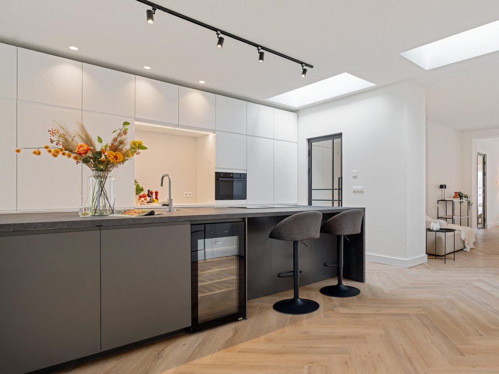 - Moderne leefkeuken met kookeiland, wijnkoeler en lichtkoepels;