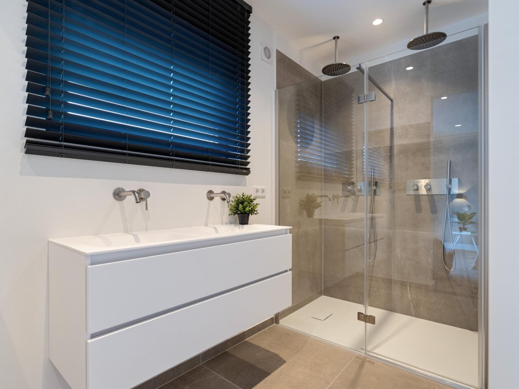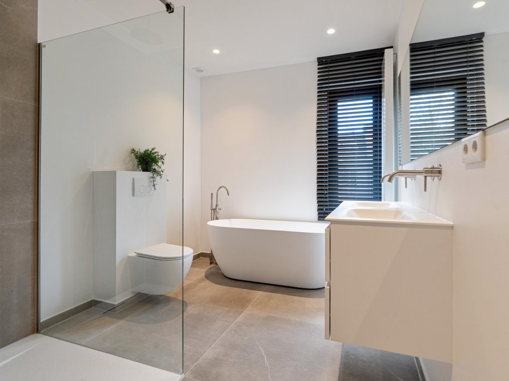 De tweede badkamer is royaal van opzet en biedt een vrijstaand ligbad, een dubbele wastafel met zwevend badmeubel, toilet en een inloopdouche met glazen scheidingswand, waardoor comfort en luxe hand in hand gaan.