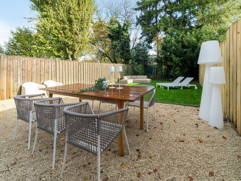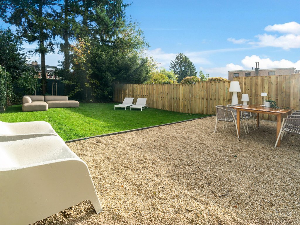 De fraai aangelegde achtertuin is bereikbaar via de keuken of via een zij-ingang aan de voorzijde van de woning. De tuin is deels voorzien van kiezels en deels van groene beplanting. Een zithoek op het kiezelgedeelte biedt een prettige plek om te ontspannen, terwijl de houten omheining zorgt voor privacy en een warme uitstraling.