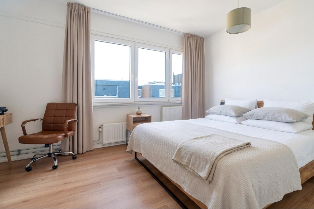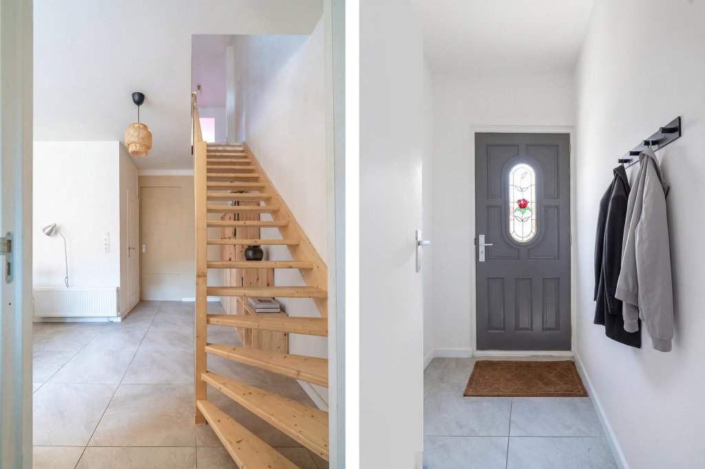 De leefkeuken biedt een open verbinding naar de ruime woonkamer. Dankzij de grote raampartijen en de toegang tot de tuin voelt de woonkamer licht en ruim aan. De gehele begane grond is afgewerkt met een nieuwe tegelvloer, wat zorgt voor een verzorgde uitstraling. In de doorgang tussen de keuken en de woonkamer bevindt zich de separate toiletruimte met hangend closet.
